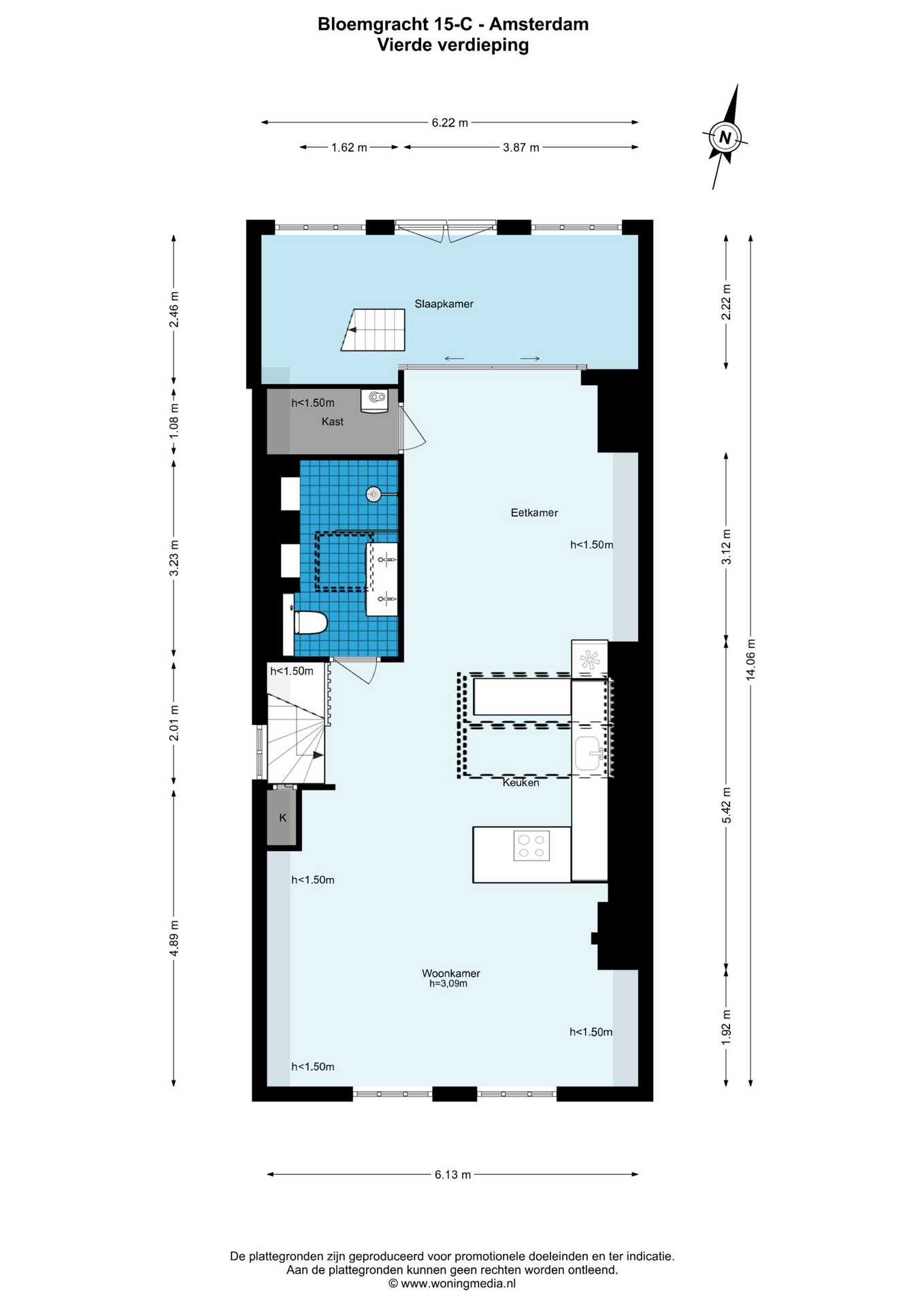 Middels het fraaie trappenhuis bereikt u de eigen entree op de derde verdieping. Hal met interne trap naar de vierde verdieping. Binnenkomst in de riante en zeer lichte woonkamer. Aan de achterzijde van de woning bevindt zich de zitkamer waar u vanaf de bank een prachtig uitzicht hebt op de Westertoren. De open u-keuken is het middelpunt van de woonkamer en is voorzien van diverse inbouwapparatuur. Aan de gezellige bar kunt u rustig werken, ontbijten of kunnen uw gasten genieten van een borrel tijdens het koken. Daarnaast is er voldoende ruimte voor een grote eettafel. De slaapkamer is gelegen aan de voorzijde en beschikt over grote raampartijen die zorgen voor veel natuurlijk licht, openslaande Franse balkondeuren, een ingebouwde kledingkast en een trap die toegang biedt tot het dakterras. Vanaf het dakterras heeft u vrij uitzicht én ook hier weer het waanzinnige kijk op de Westertoren! De badkamer beschikt over een WC, dubbele wastafel en inloopdouche. Er is een separate bergkast met wasmachineaansluiting.