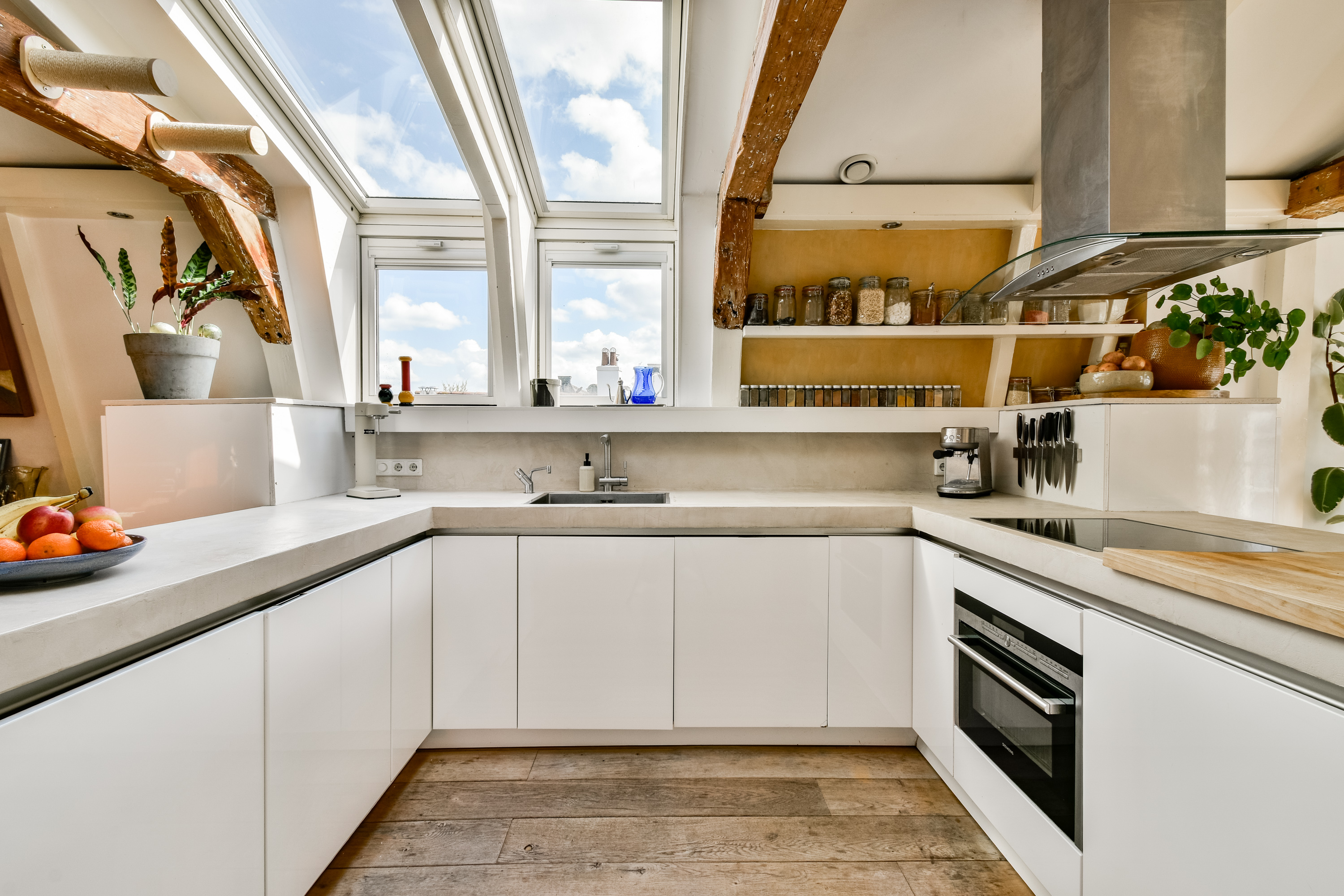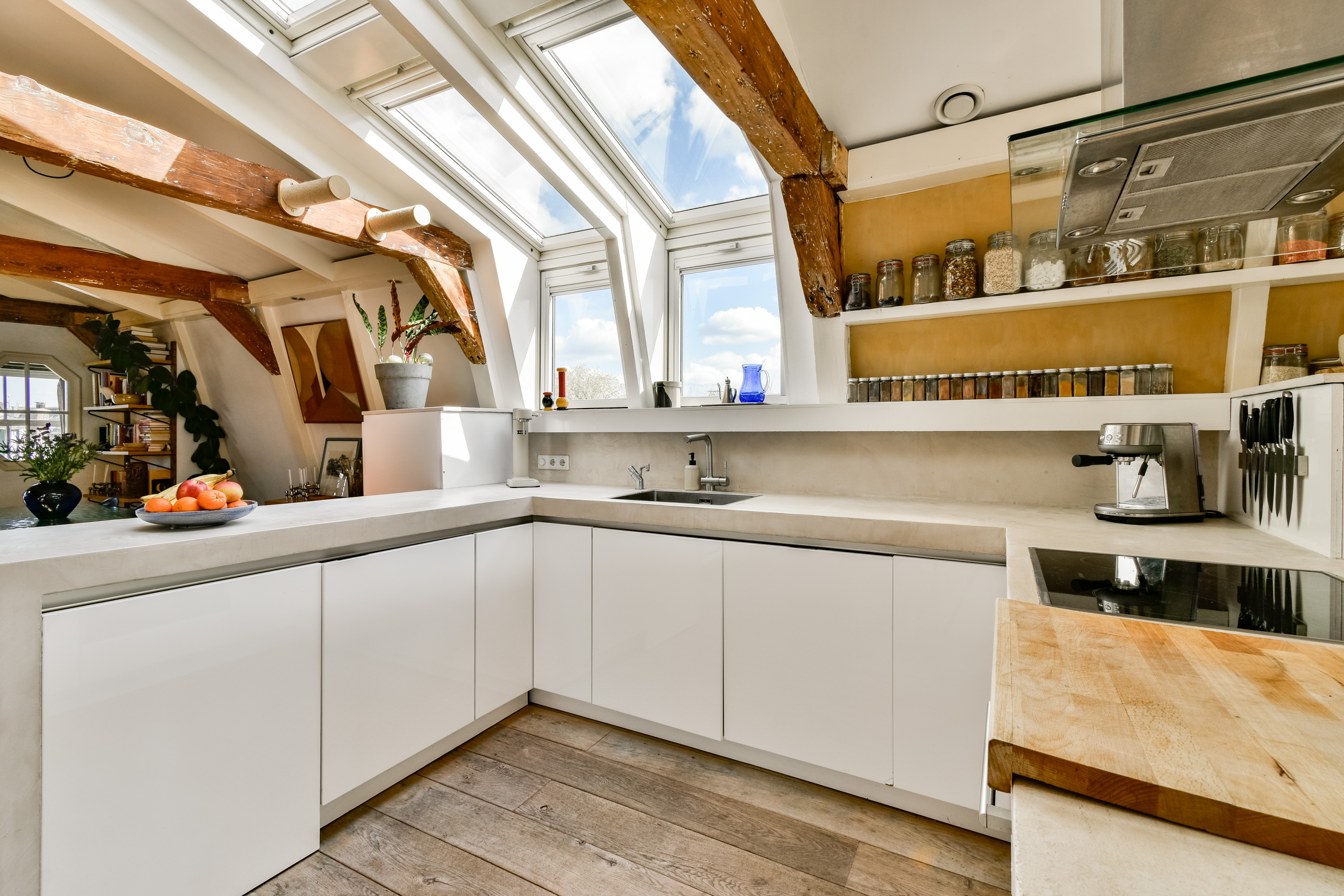 You reach the private entrance on the third floor via the beautiful staircase. Hallway with internal stairs to the fourth floor. Upon entering, you arrive in the spacious and very bright living room. At the rear of the apartment is the sitting room, where you have a beautiful view of the Westertoren from the sofa. The open U-shaped kitchen is the focal point of the living room and is equipped with various built-in appliances. At the cozy bar, you can work quietly, have breakfast, or your guests can enjoy a drink while you cook. Additionally, there is ample space for a large dining table. The bedroom is located at the front and features large windows providing plenty of natural light, French balcony doors, a built-in wardrobe, and stairs leading to the roof terrace. From the roof terrace, you have an unobstructed view and, once again, the amazing view of the Westertoren! The bathroom features a toilet, double sink, and walk-in shower. There is a separate storage cupboard with a washing machine connection.
