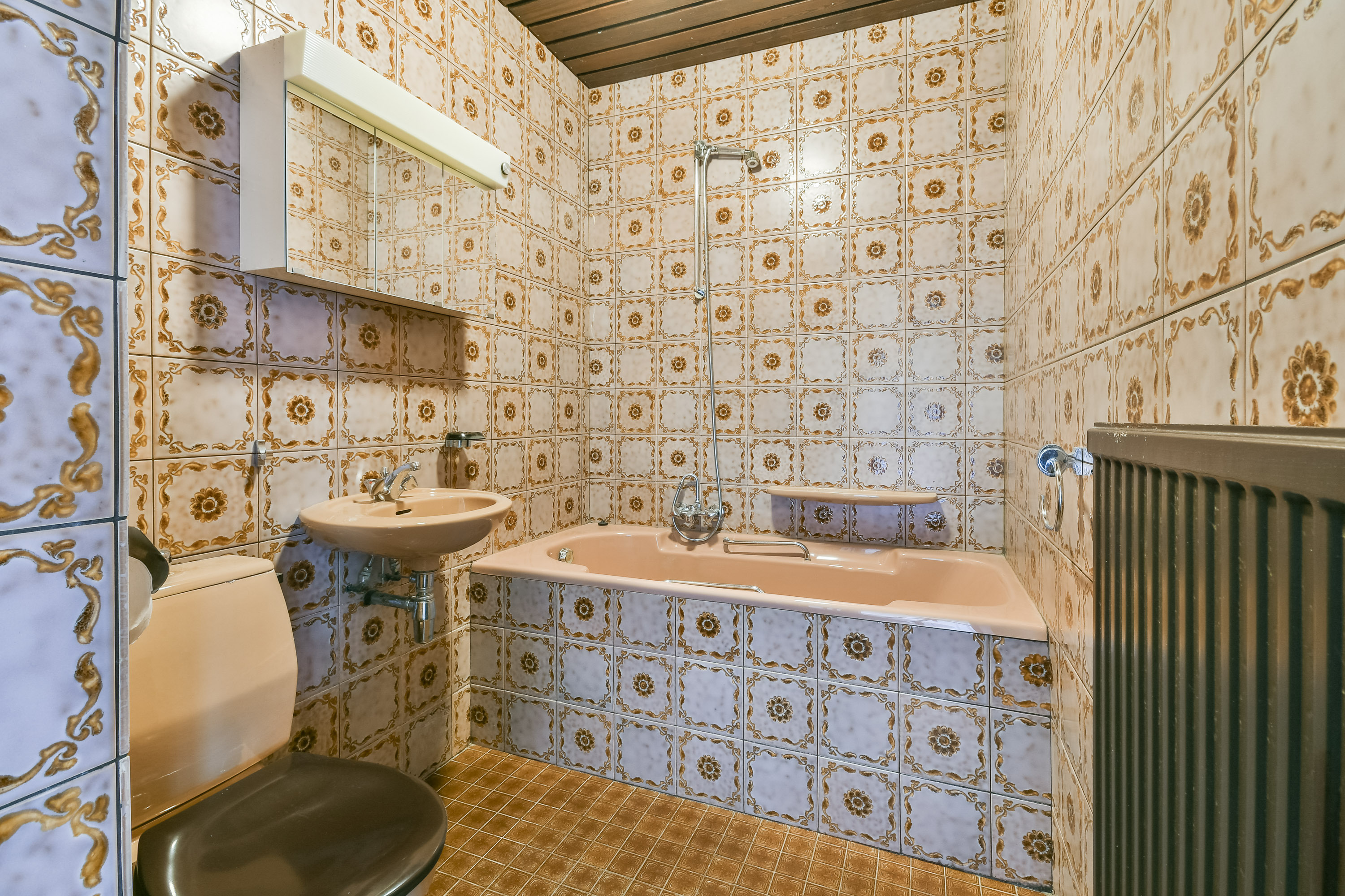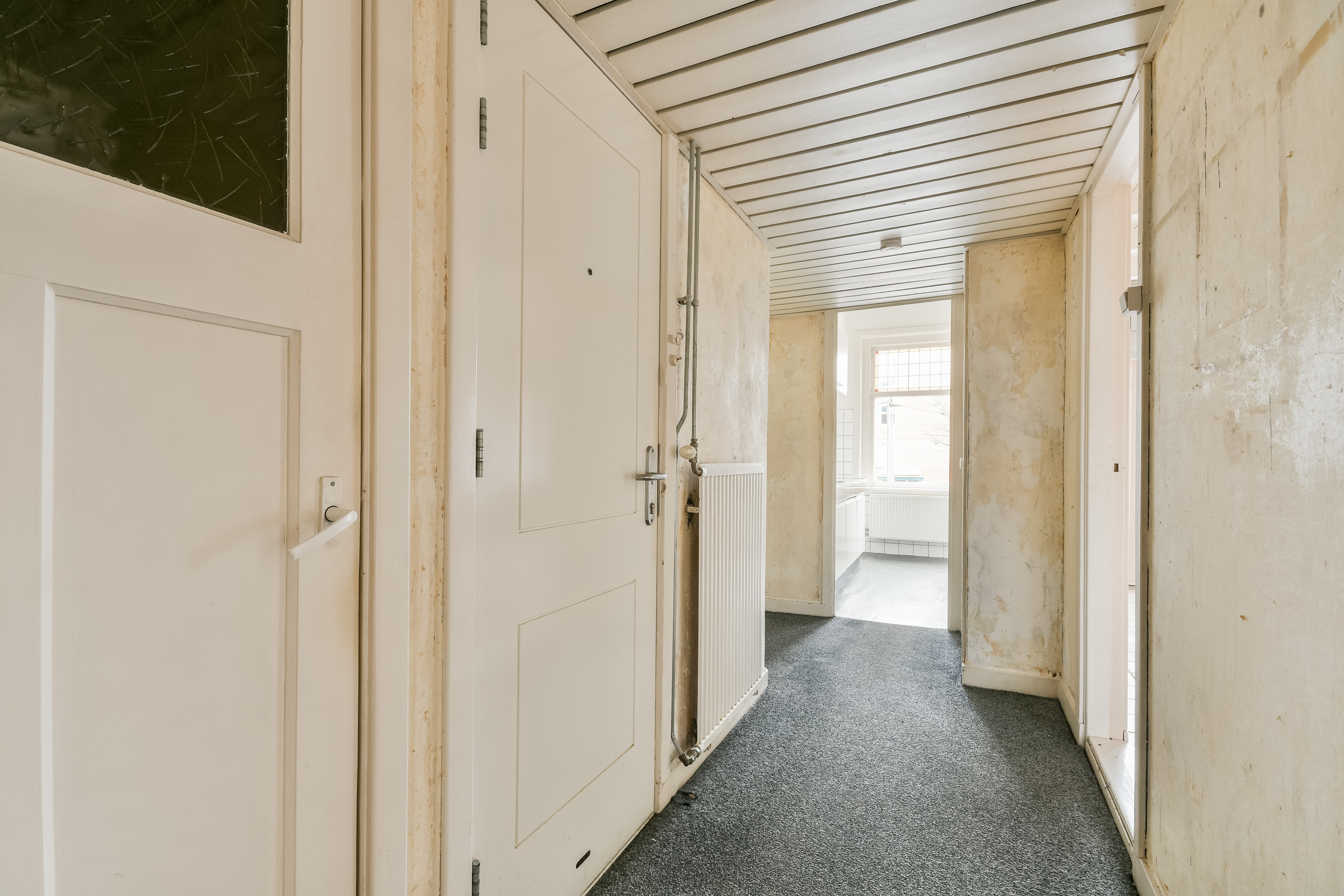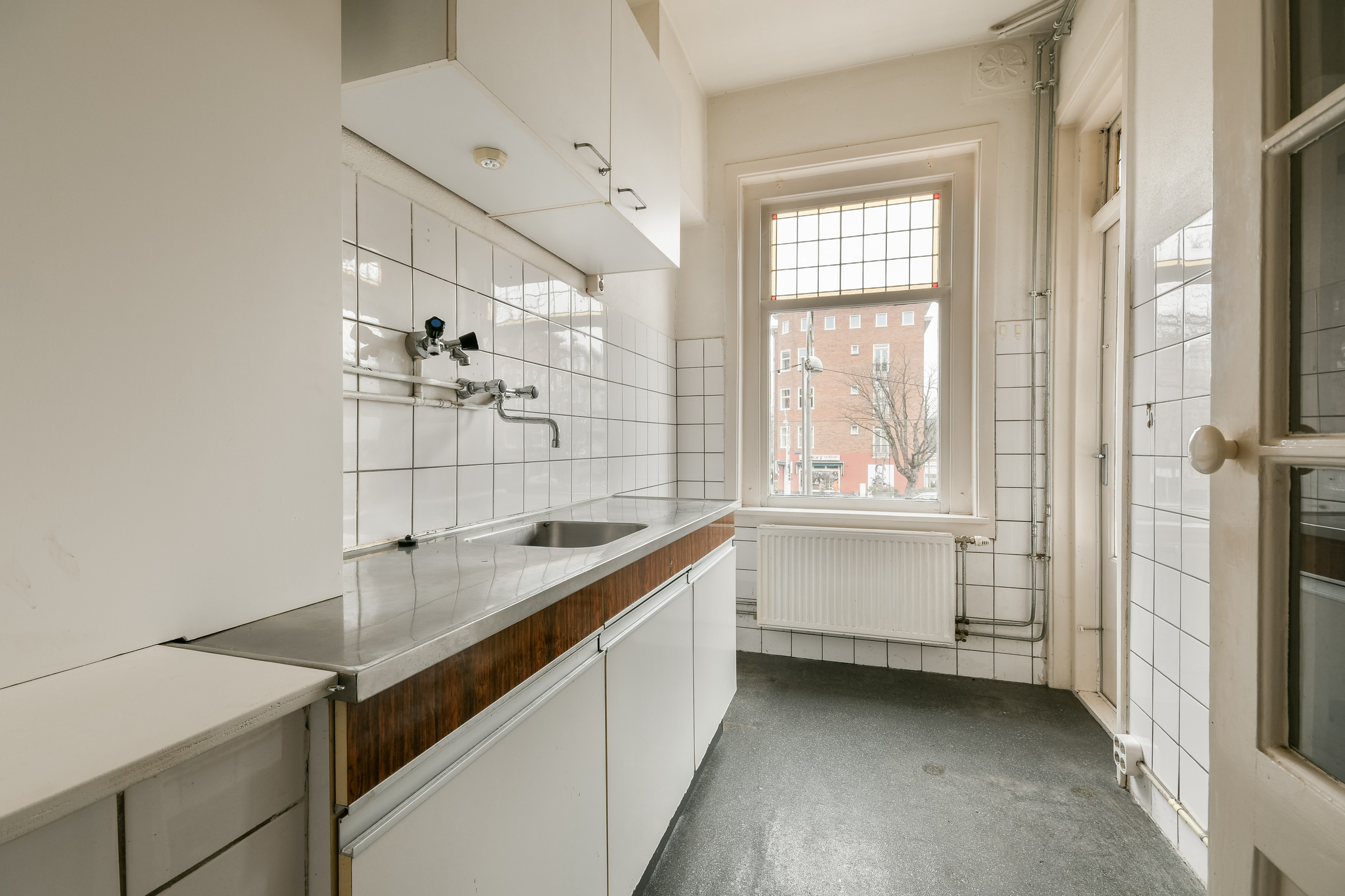 The apartment is located on the first floor and benefits from pleasant natural light thanks to the large windows at both the front and rear. At the front, the characteristic stained-glass windows add a charming and atmospheric touch. The current layout offers a spacious living room, a separate kitchen, and two well-proportioned bedrooms, with the possibility to easily create a third bedroom or an open-plan kitchen. This makes the property ideally suited to be modernised and arranged entirely according to one’s own taste and preferences.