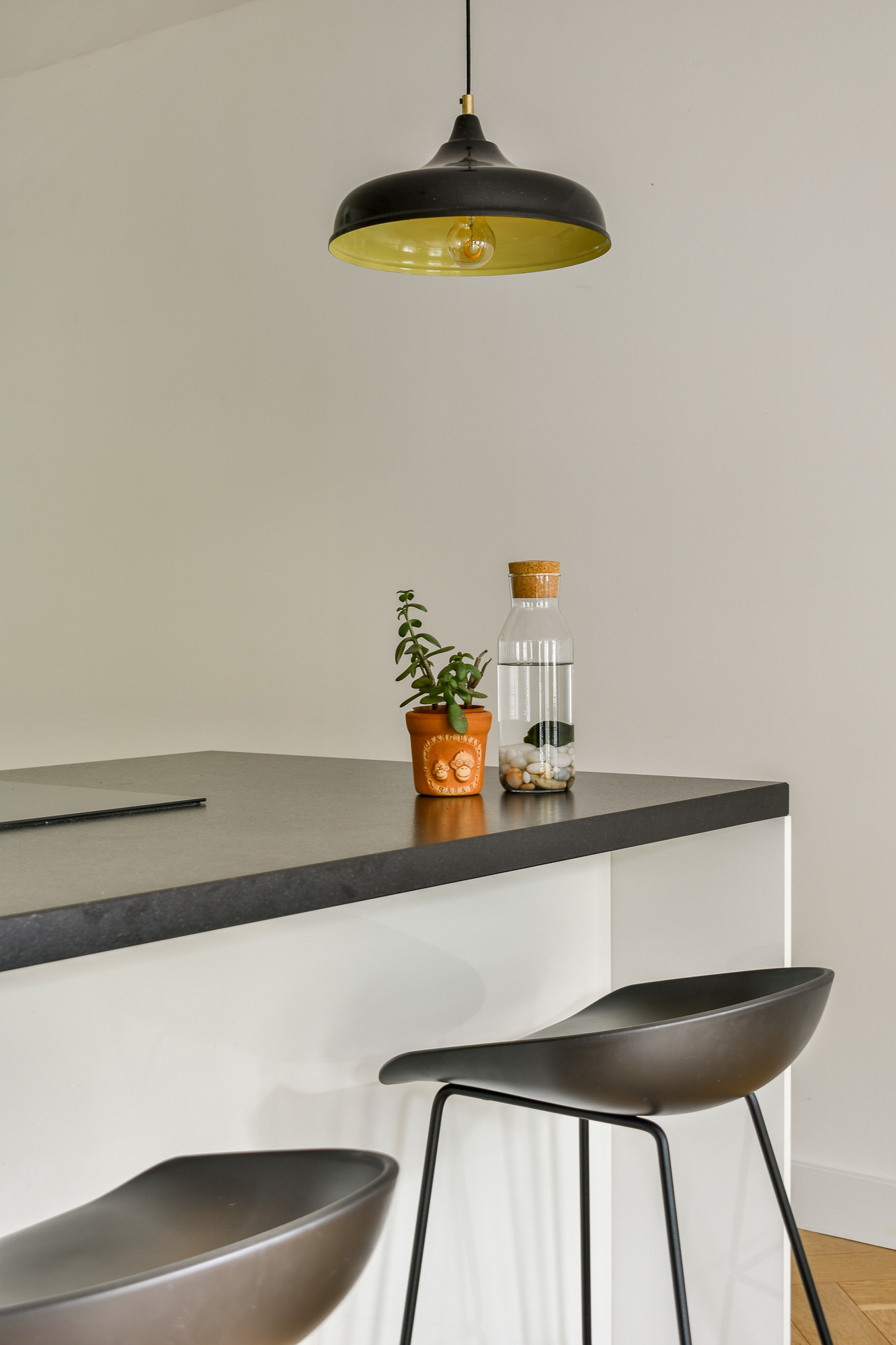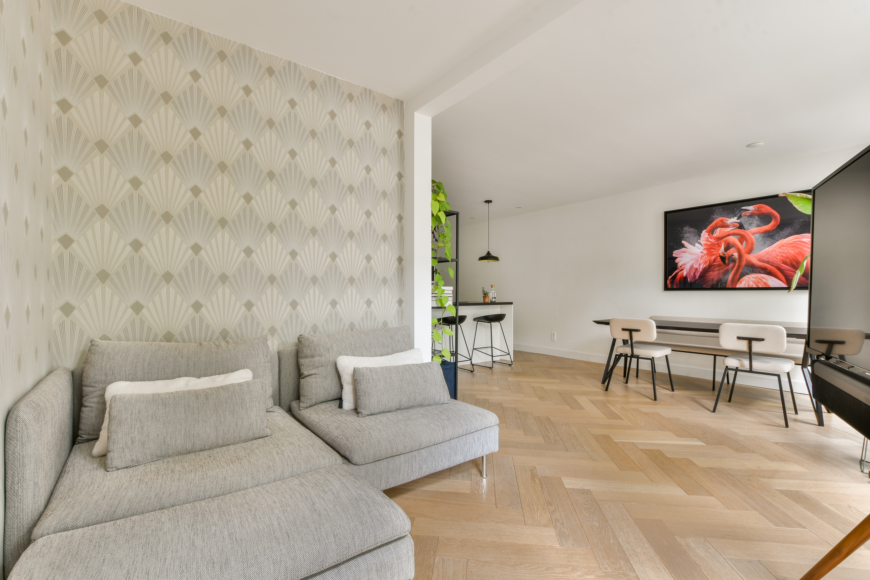 - The entire apartment features a wooden herringbone parquet floor with underfloor heating
