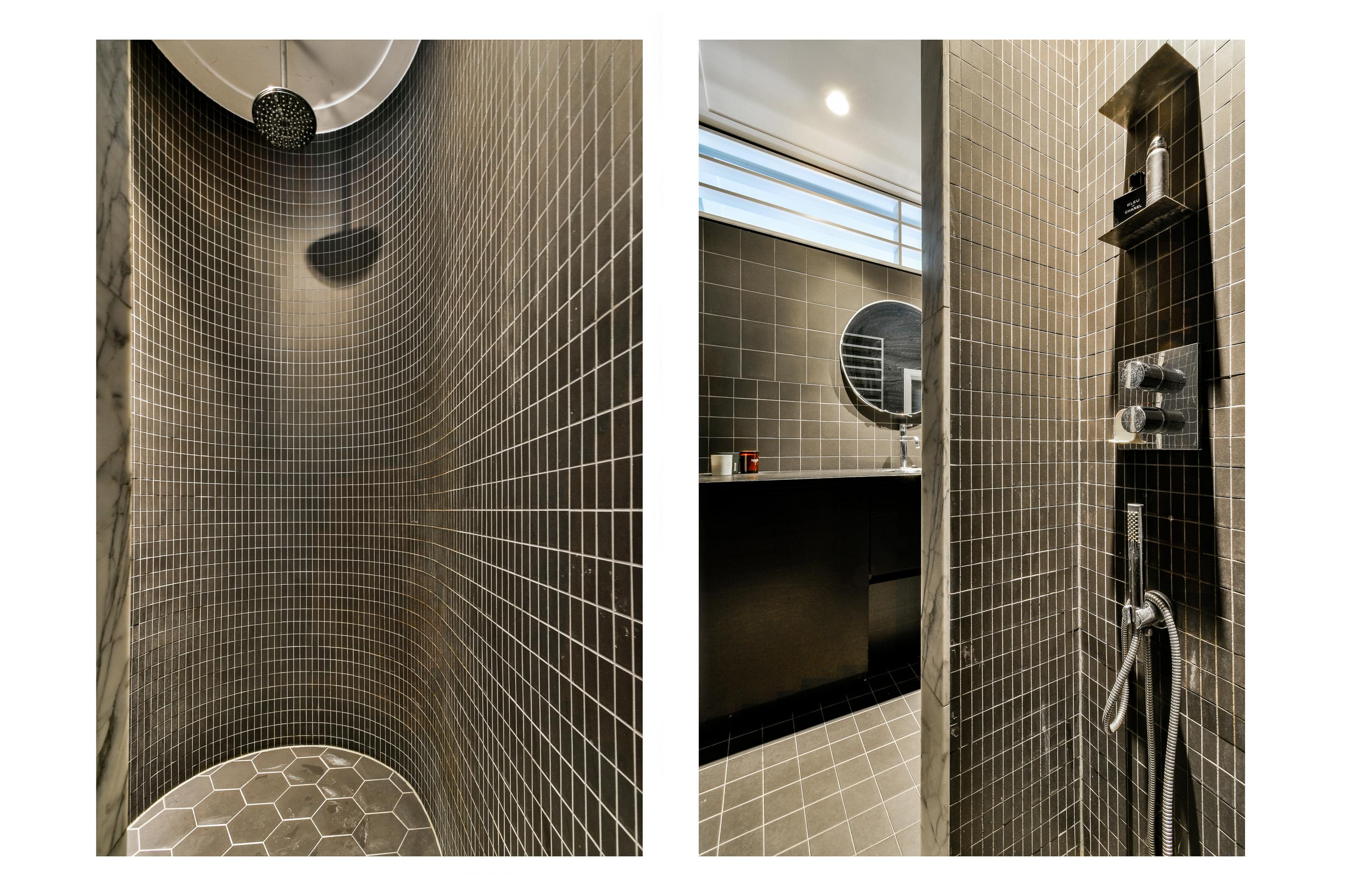 The spacious bathroom features a playful round shower and a large vanity unit, which also houses the washing machine. A window above the vanity unit allows for plenty of natural light. The apartment also has a separate toilet with a small sink.