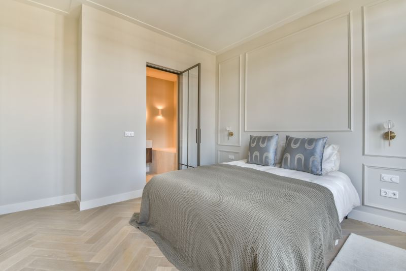 Throughout the house, there is a wooden herringbone floor with underfloor heating.