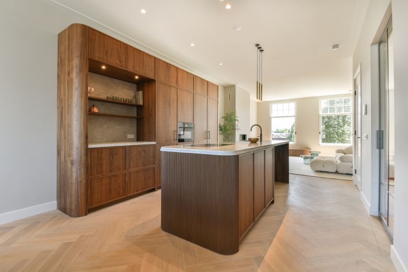 Door de gehele woning ligt een houten visgraat vloer met vloerverwarming.