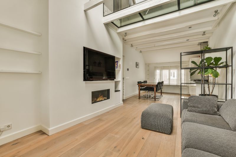 Stairs to the second floor. The landing provides access to the living and dining room. The modern open-plan kitchen is located at the front of the house and is equipped with all necessary built-in appliances, including a 4-burner gas stove, oven, and dishwasher. Adjacent is the spacious living room with a comfortable seating area and gas fireplace. The second bedroom/study is reached via the landing. This floor also houses the second bathroom, which features a shower/bath combination, toilet, and sink.