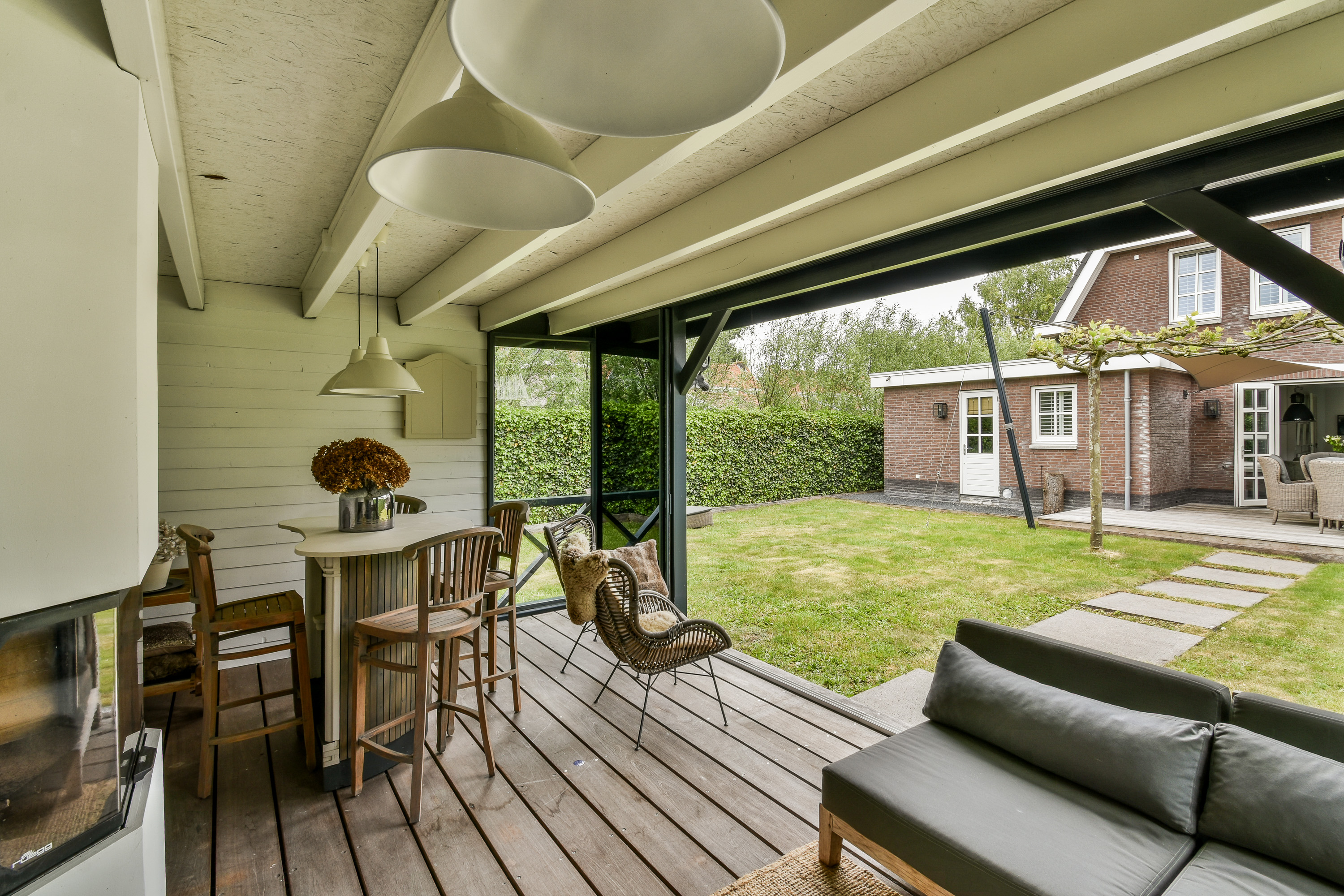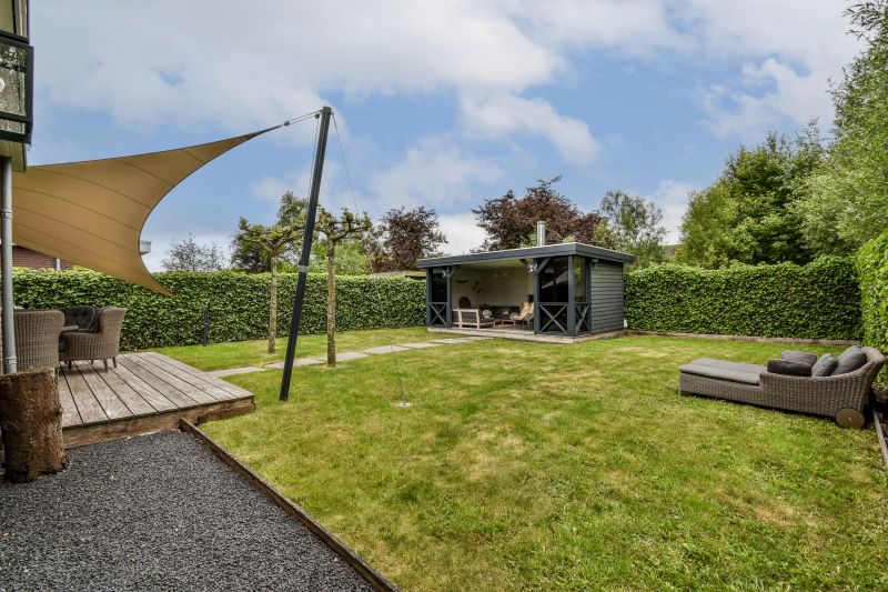 De royale achtertuin op het zuidwesten biedt veel privacy, ruimte en altijd een plekje in de zon. Hier bevindt zich de sfeervolle, vrijstaande buitenkamer (onderheid) van circa 20 m², voorzien van elektra, coax aansluiting en een gezellige houthaard – een heerlijke plek om te ontspannen, werken of gasten te ontvangen, het hele jaar door.