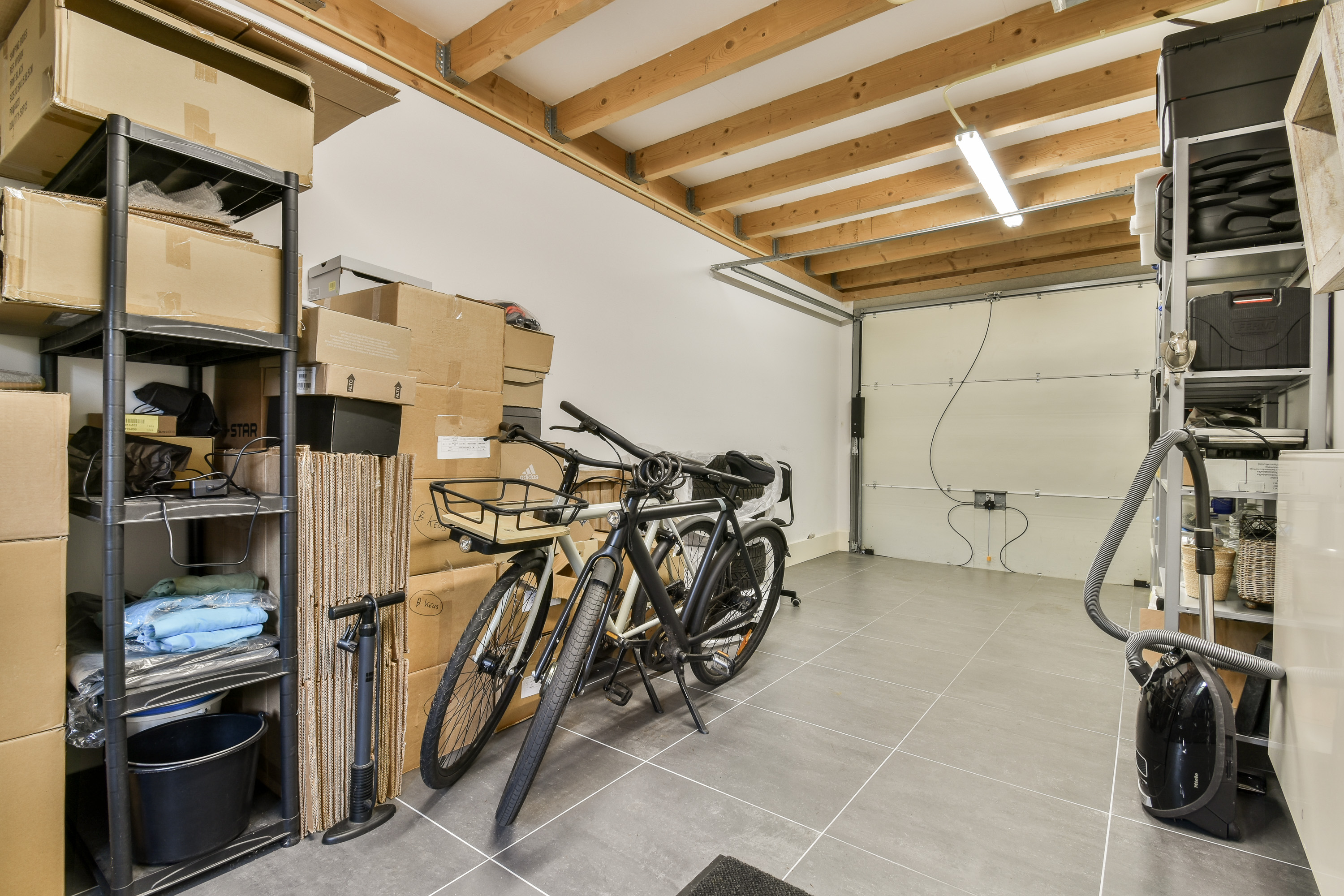 Aansluitend is er een bijkeuken met vriezer, extra bergruimte en met toegang tot de garage. De garage (21,8 m²) heeft aan de voorkant een grote garage deur en een achterdeur naar de tuin.