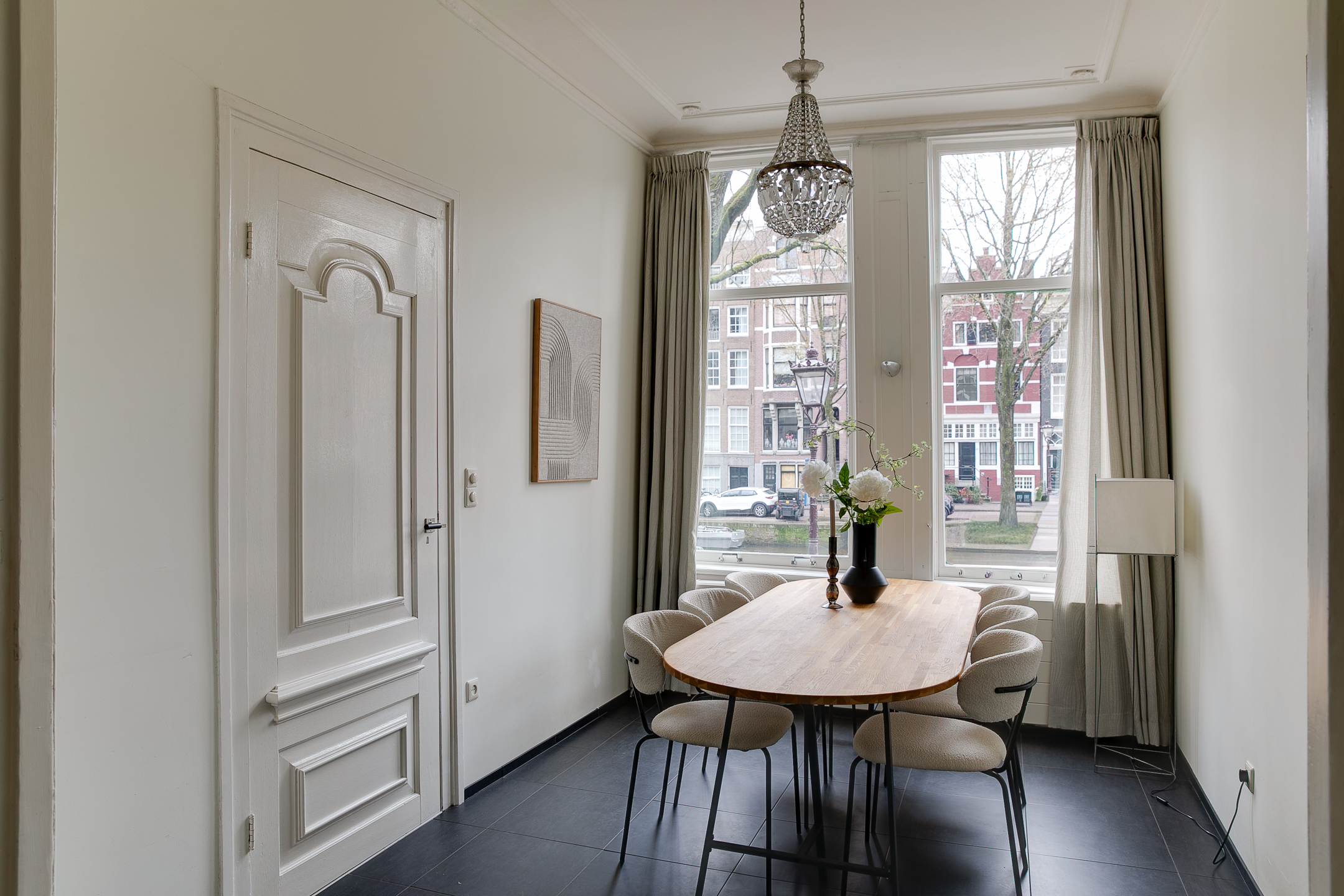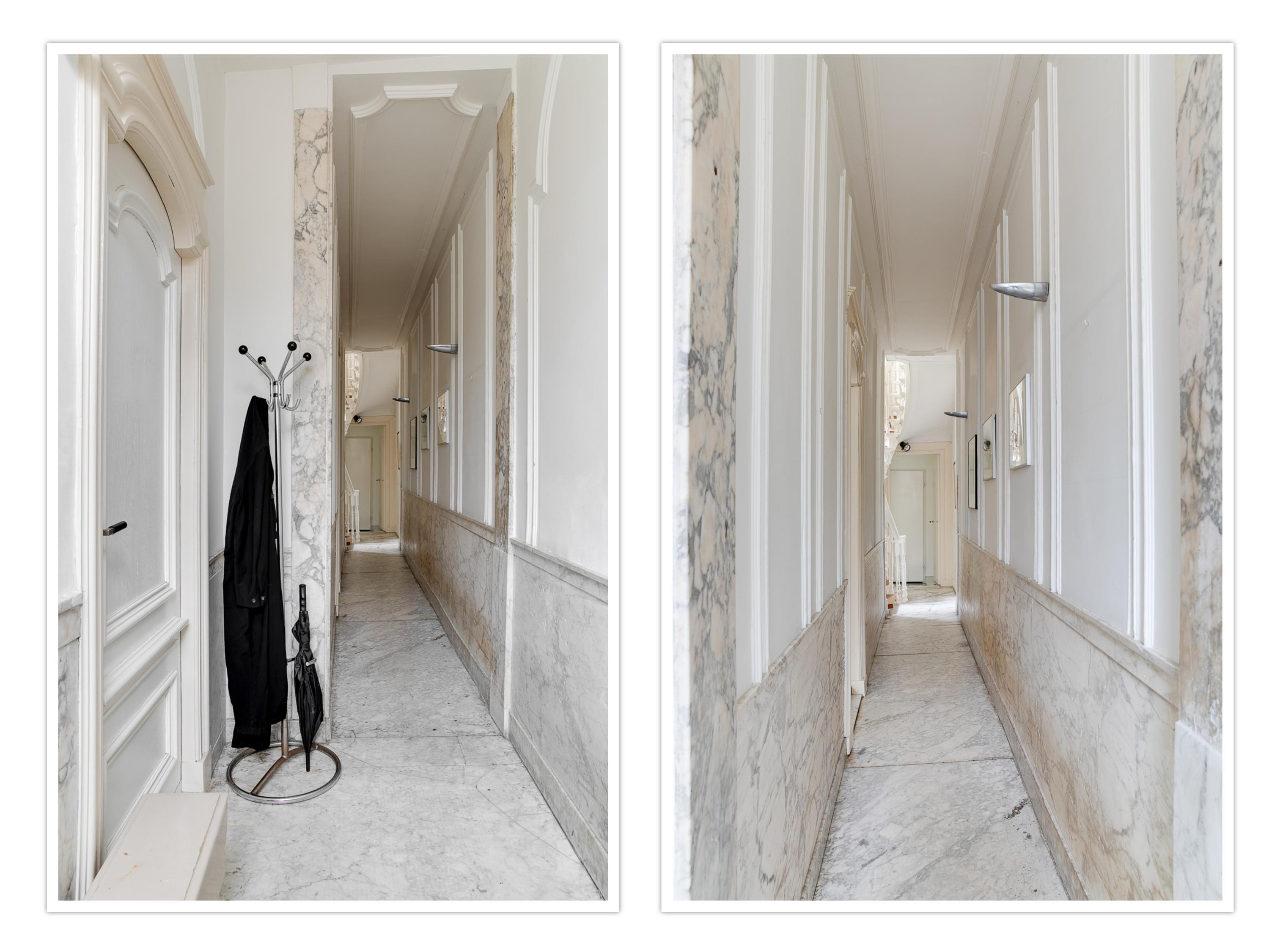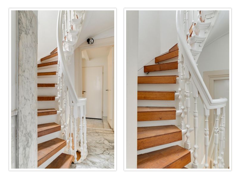 Main entrance on the bel-etage with landing and bench, stately hall with original marble floor and marble panelling. Kitchen equipped with various built-in appliances. In the dining room at the front you have a fantastic view over the canal. In the back house there is a room with various built-in cupboards, washer/dryer connection and a separate toilet with washbasin. In the hall a beautiful oak spiral staircase connects the floors.