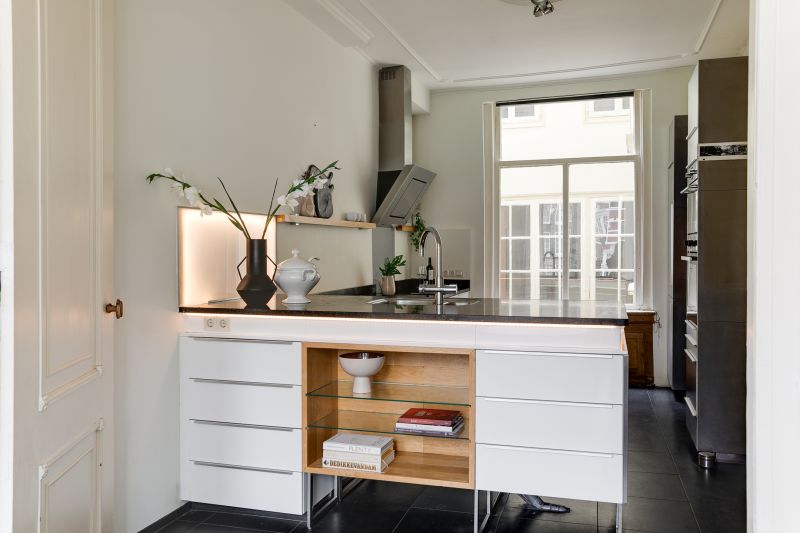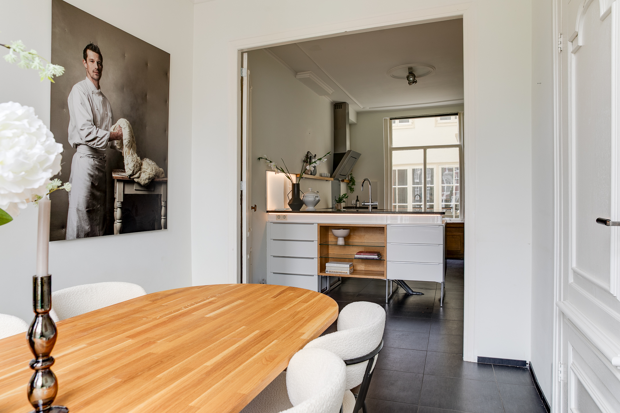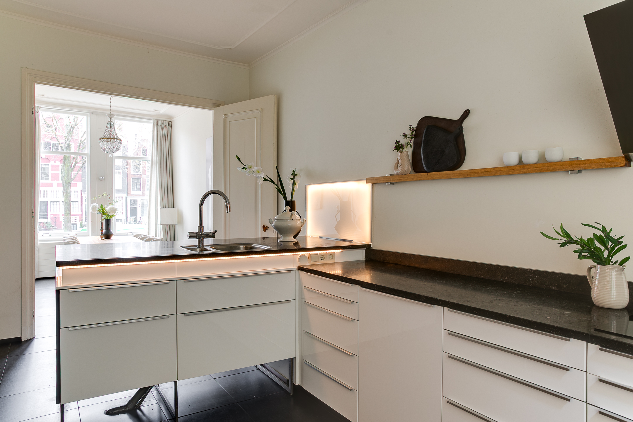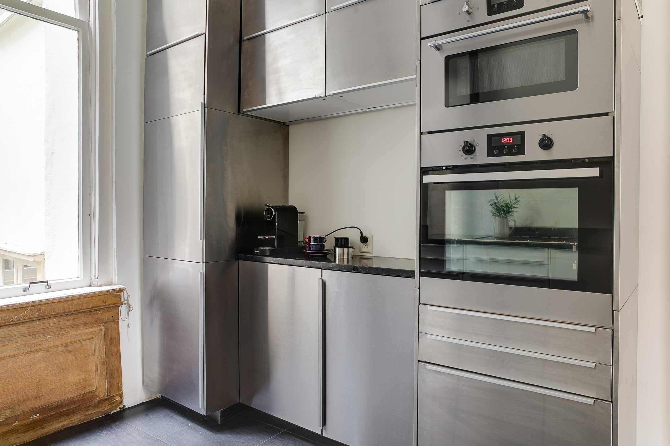 Main entrance on the bel-etage with landing and bench, stately hall with original marble floor and marble panelling. Kitchen equipped with various built-in appliances. In the dining room at the front you have a fantastic view over the canal. In the back house there is a room with various built-in cupboards, washer/dryer connection and a separate toilet with washbasin. In the hall a beautiful oak spiral staircase connects the floors.