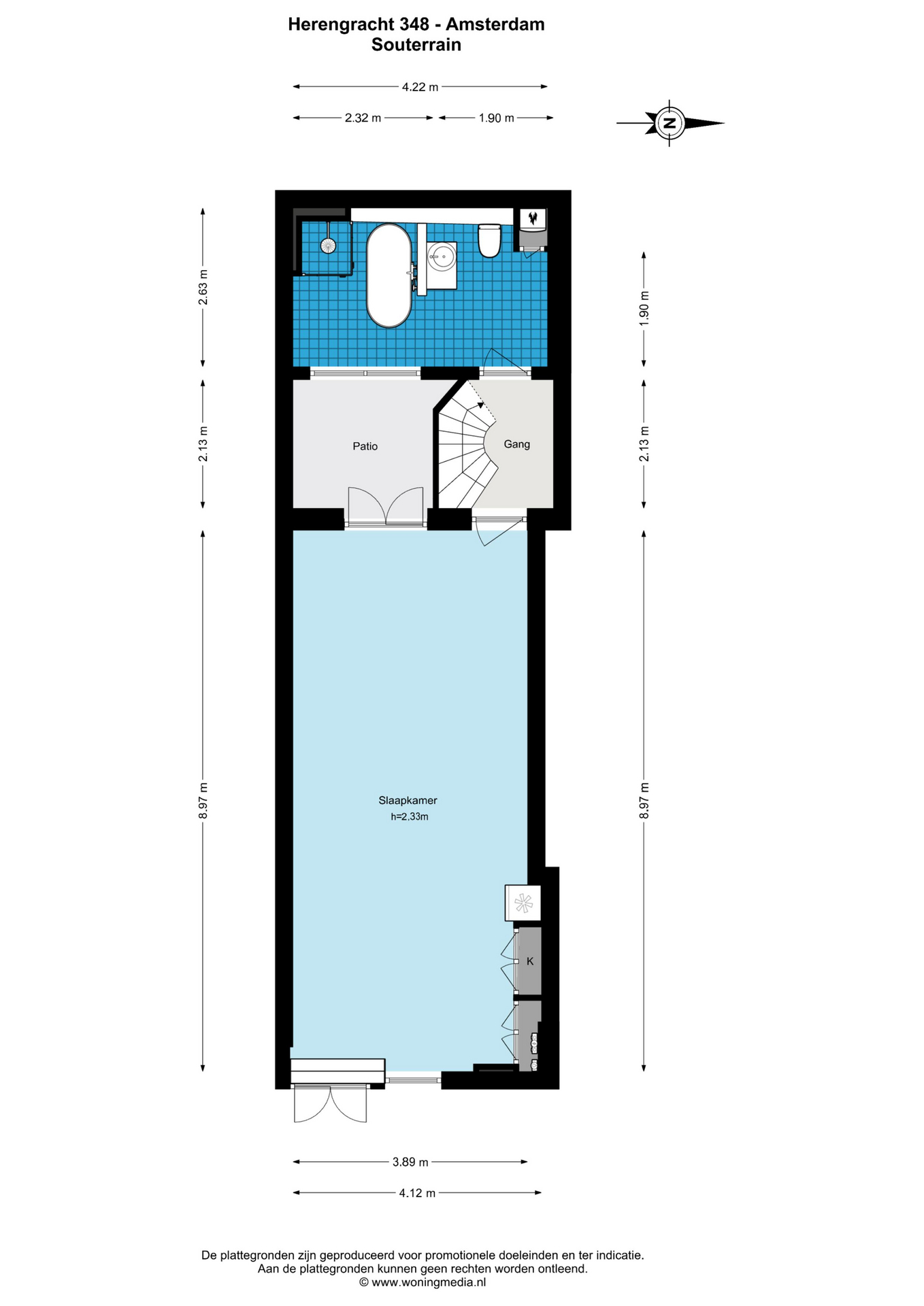 Ruime slaap/woonkamer met eigen opgang vanaf de straat. Er zijn diverse inbouwkasten, inclusief een koelkast. De openslaande deuren aan de achterzijde geven toegang tot de patio. De ruime badkamer in het achterhuis is voorzien van inloopdouche, vrijstaand ligbad, wastafel en WC. Het souterrain is thans in gebruik als bed & breakfast, maar zou ook geschikt zijn als gastenverblijf, praktijk aan huis of voor een inwonende au-pair.