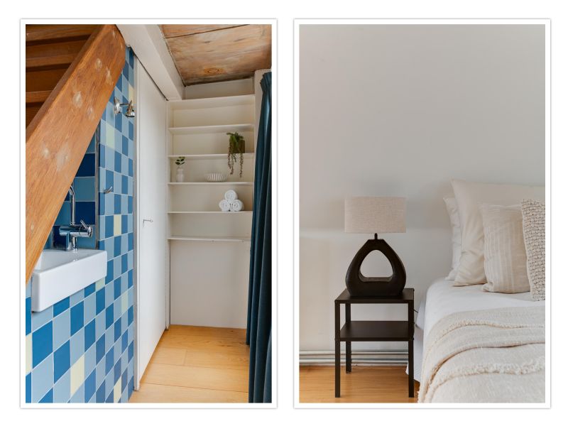 Landing, spacious living room at the front with large windows that again offer a view of the water and provide beautiful light. There is a custom-made cupboard with sliding doors. The room in the back house is used as a workshop.