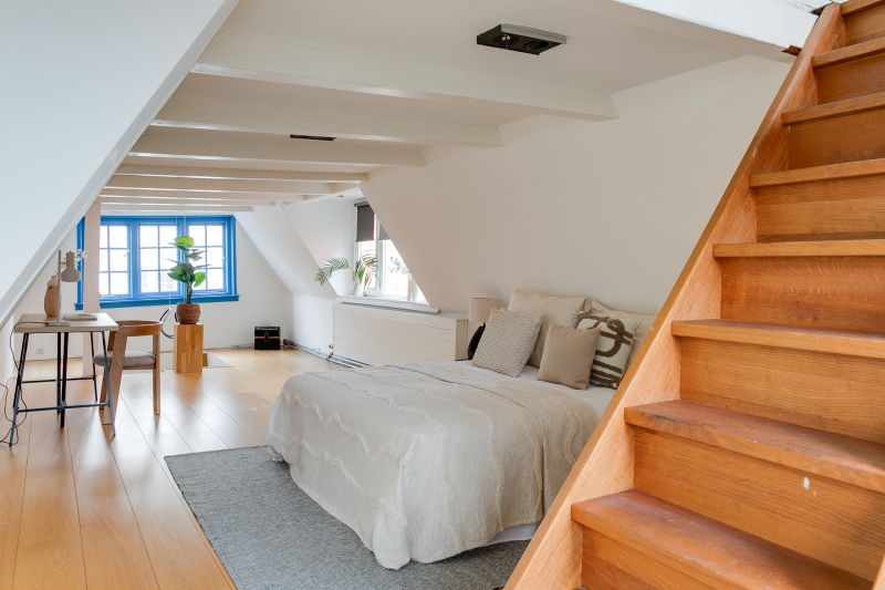 Overloop, ruime woonkamer aan de voorzijde met grote raampartijen die wederom uitzicht bieden op het water en zorgen voor een mooie lichtinval. Er is een op maat gemaakte kast met schuifdeuren. De kamer in het achterhuis wordt gebruikt als werkplaats.