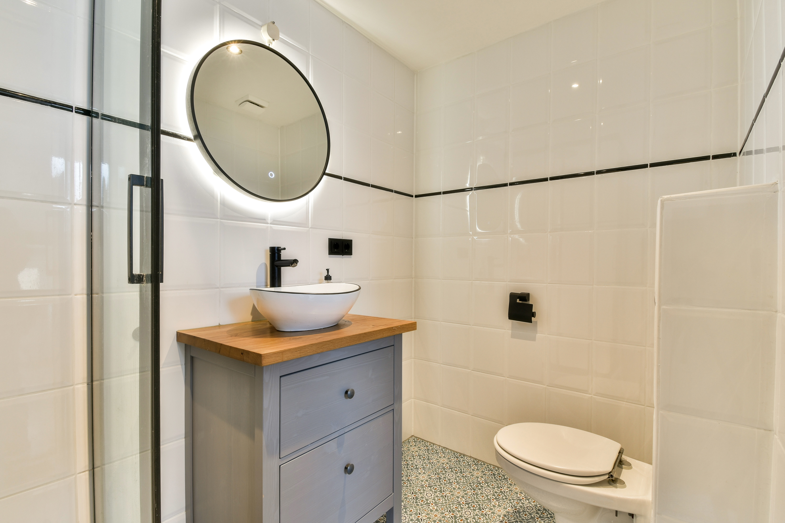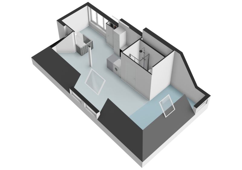 Het slaapgedeelte grenst aan de woonkamer en kan desgewenst eenvoudig worden afgescheiden met een tussenwand. Er is een praktische inbouwkast aanwezig. De badkamer is afgewerkt in moderne stijl met zwarte accenten. Deze is uitgerust met een inloopdouche, zwevend toilet, wastafelmeubel, verlichte spiegel en volledige betegeling. Extra bergruimte bevindt zich boven de badkamer en de trap.