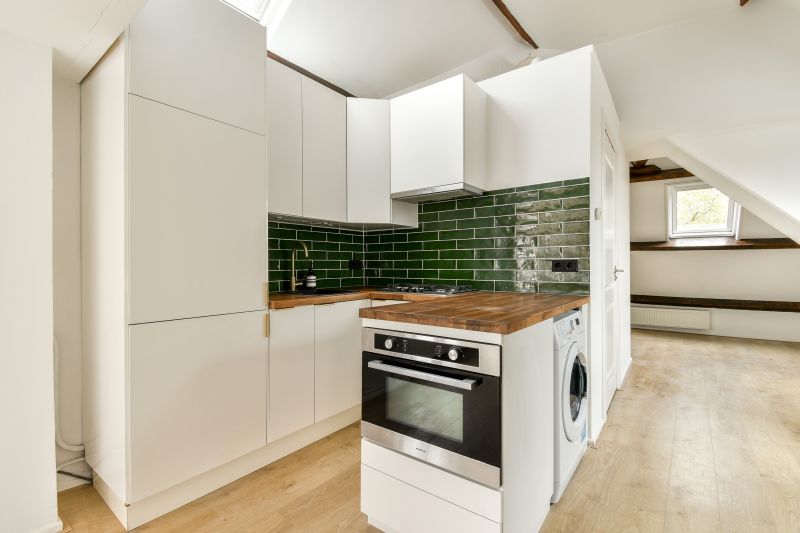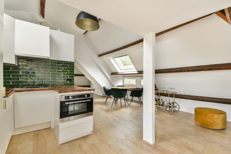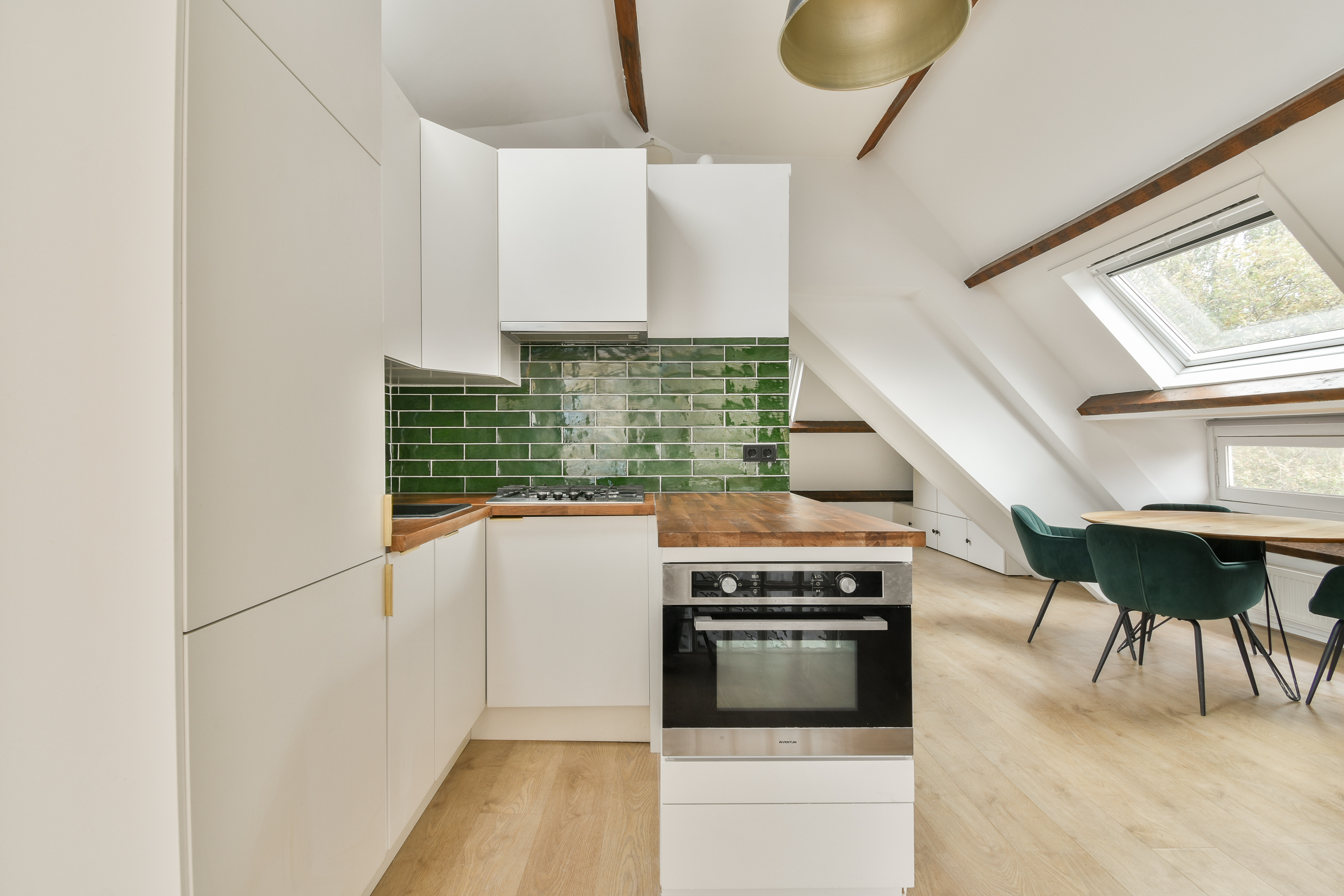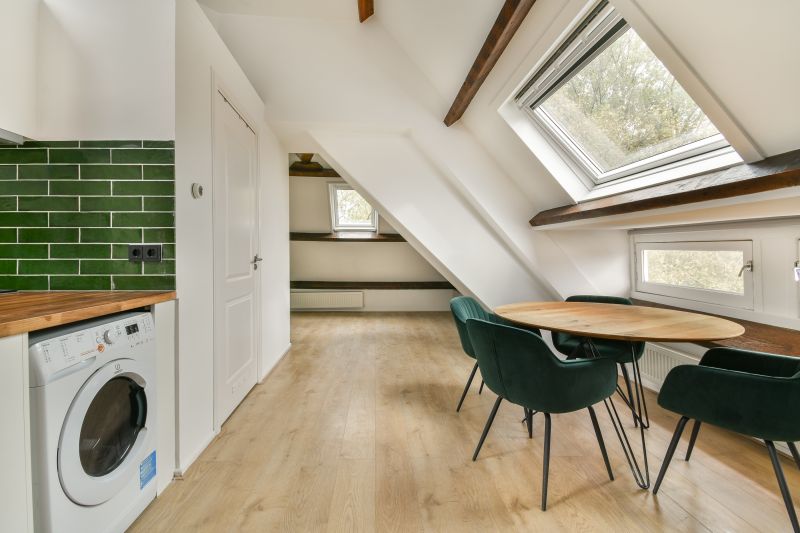 The neat communal staircase leads to the entrance of this lovely apartment on the third floor. A staircase leads to the living area, which extends like an open loft over almost eleven meters. The living room is spacious and exceptionally bright, with a cozy sitting area and a dining area by the side windows and skylight. The open-plan kitchen is centrally located and equipped with a refrigerator, 3-drawer freezer, 4-burner gas stove, sink, combination oven, and washing machine connection.