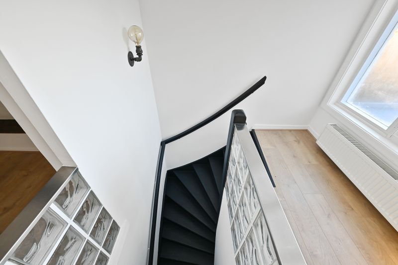 The sleeping area is adjacent to the living room and can easily be partitioned off with a partition wall if desired. A practical built-in wardrobe is included. The bathroom is finished in a modern style with black accents. This property is equipped with a walk-in shower, wall-hung toilet, vanity unit, illuminated mirror, and full tiling. Additional storage space is located above the bathroom and the stairs.