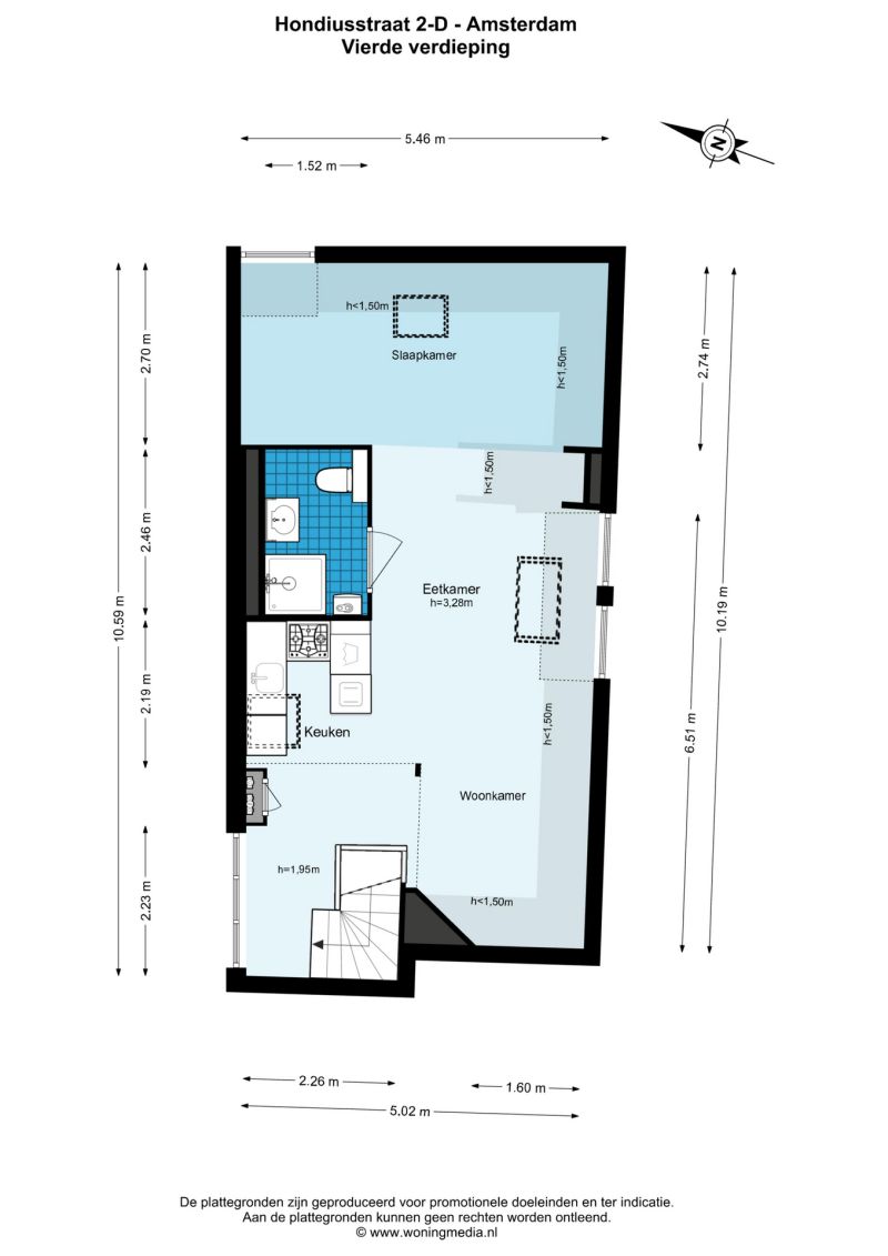Via het nette gemeenschappelijke trappenhuis bereik je op de derde verdieping de entree van dit fijne appartement. Een trap leidt naar het woongedeelte, dat zich als een open loft uitstrekt over bijna elf meter lengte. De woonkamer is royaal en bijzonder licht, met een sfeervolle zithoek en een eethoek bij de zijramen en het dakraam. De open keuken is centraal in de ruimte geplaatst en voorzien van een ijskast, 3-lade vriezer, 4-pits gasfornuis, spoelbak, combioven en de wasmachine-aansluiting.