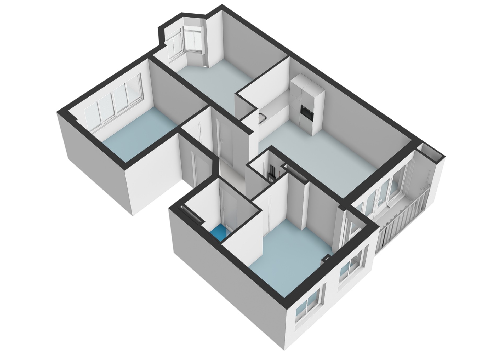 Communal staircase to the first floor. Entrance with a spacious hall featuring a cupboard for the central heating boiler, washing machine, and dryer. The bathroom is equipped with a walk-in shower, vanity unit, and toilet. Three good-sized bedrooms, one at the rear and two at the front. Living room with open kitchen on the garden side with access to the balcony. The modern kitchen is equipped with various built-in appliances. This space can be further enlarged by adding the bedroom at the front (see alternative floor plan). This creates a spacious and bright living room with windows on both sides, featuring a bay window at the front and a balcony at the rear. PARTICULARS