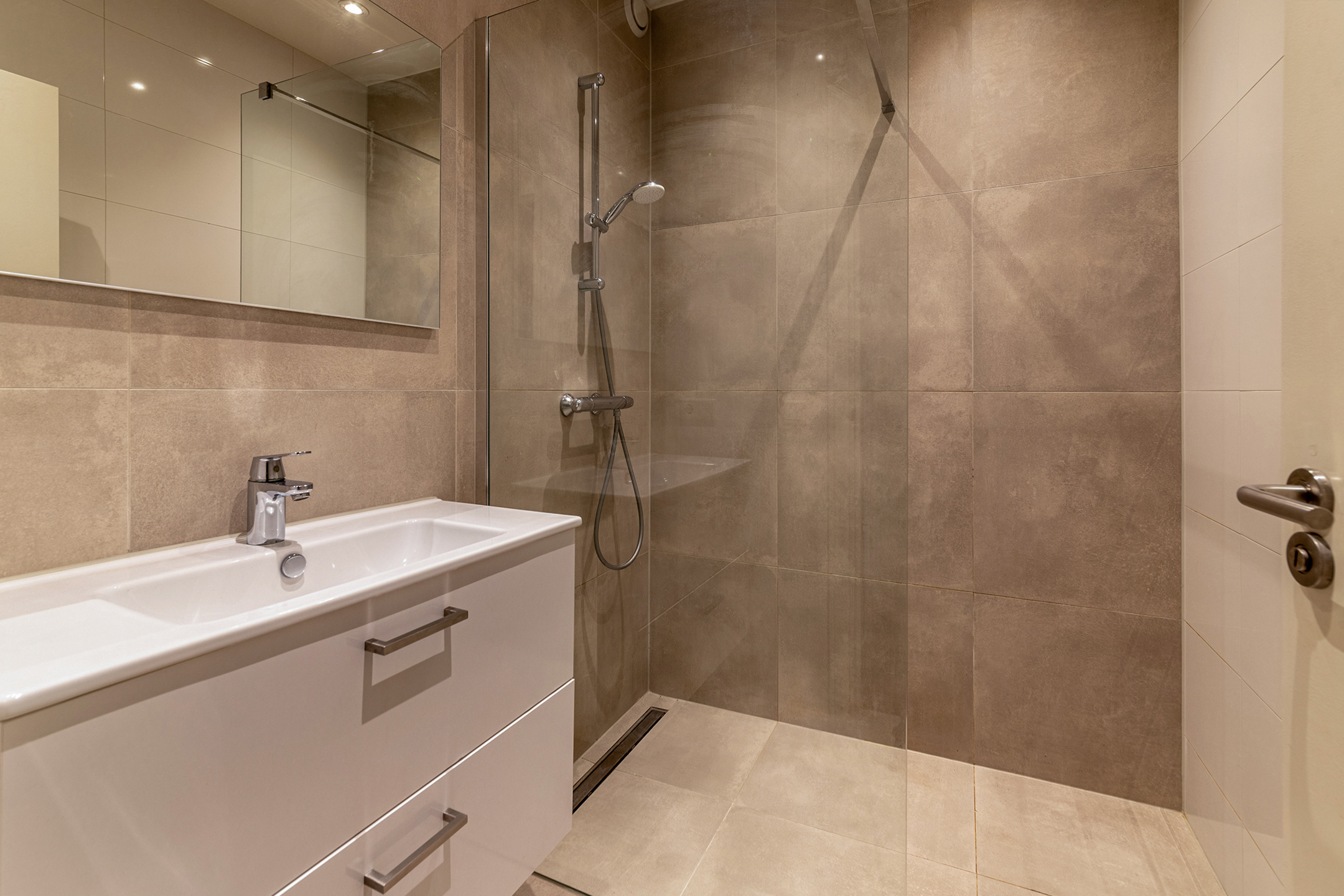 De nette badkamer beschikt over een inloopdouche, wastafelmeubel met spiegel en handdoekradiator. Seperate WC met fonteintje en een aparte kast voor de wasmachine en droger. Aan de achterzijde bevinden zich 2 goed bemeten slaapkamers die beide toegang bieden tot het heerlijk zonnige balkon.