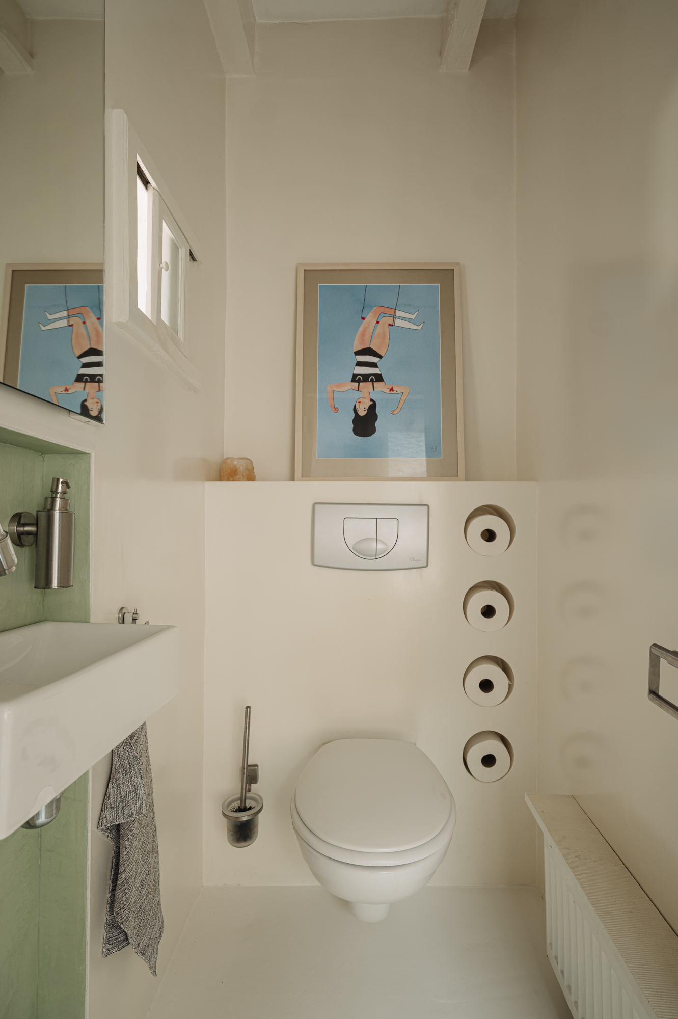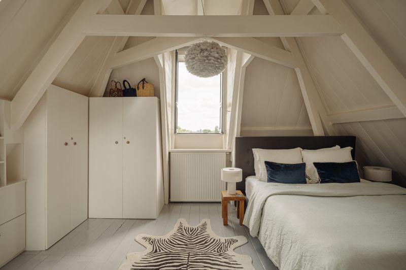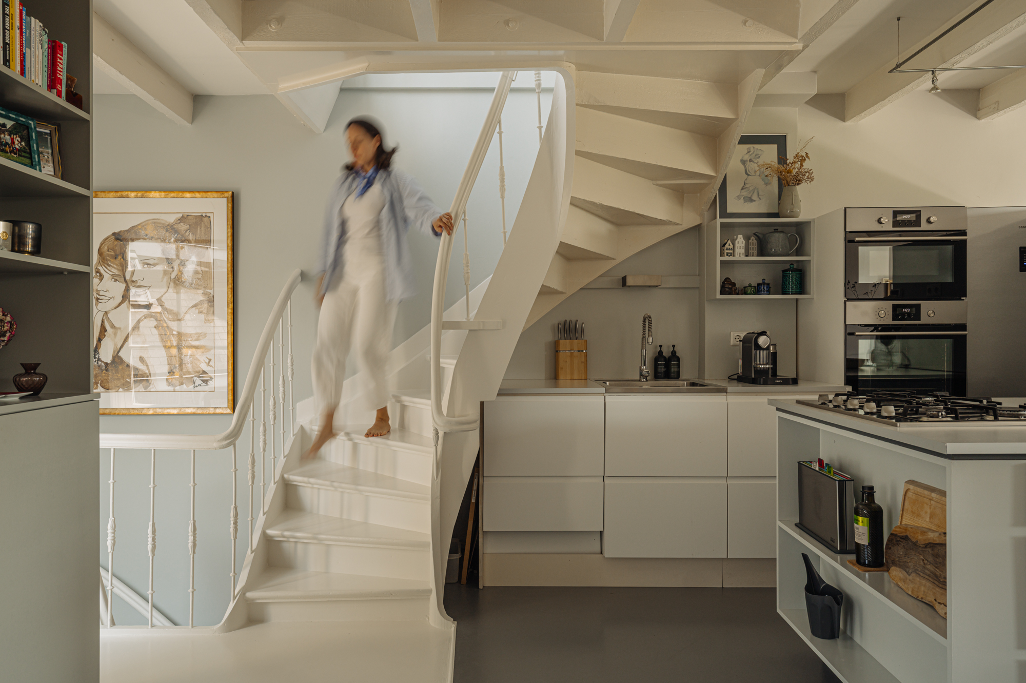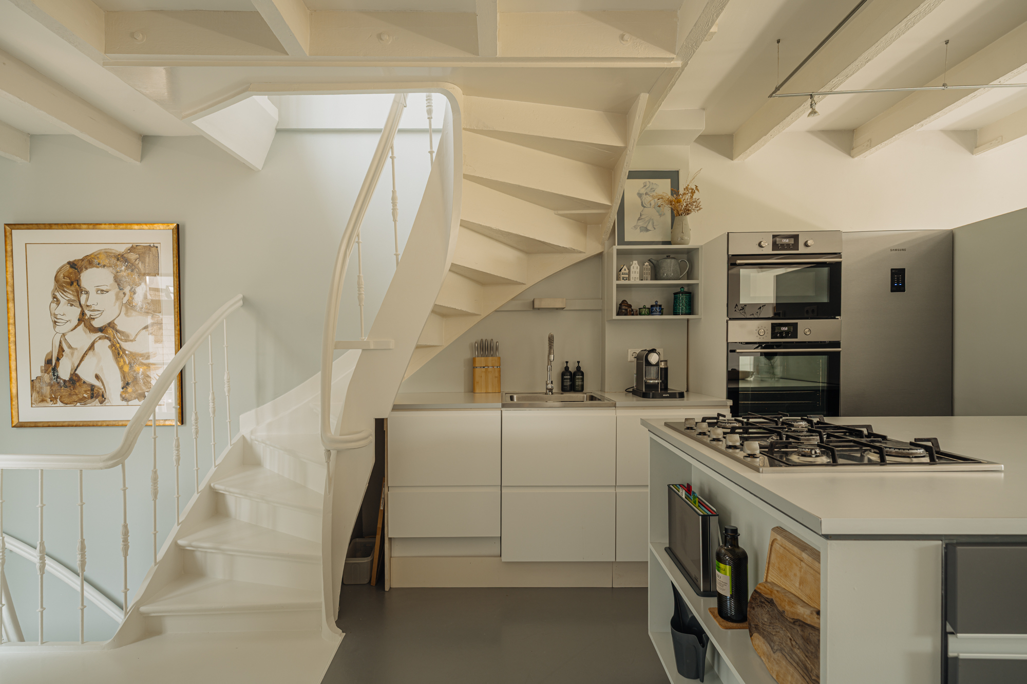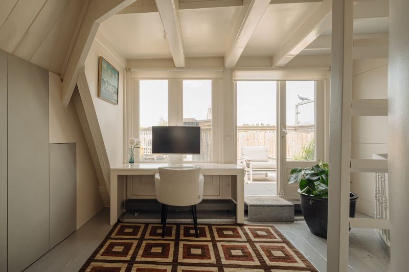 On the fourth floor, exposed wooden beams and the original roof structure add extra character to the home. At the front is a bedroom with a dormer window; centrally located is the bathroom with a walk-in shower and washbasin; and at the rear, a spacious open area with French doors opening onto the approx. 6 m² roof terrace. This space can easily be used as a second bedroom. A fold-out staircase leads to a cosy loft area for storage or an additional sleeping spot.