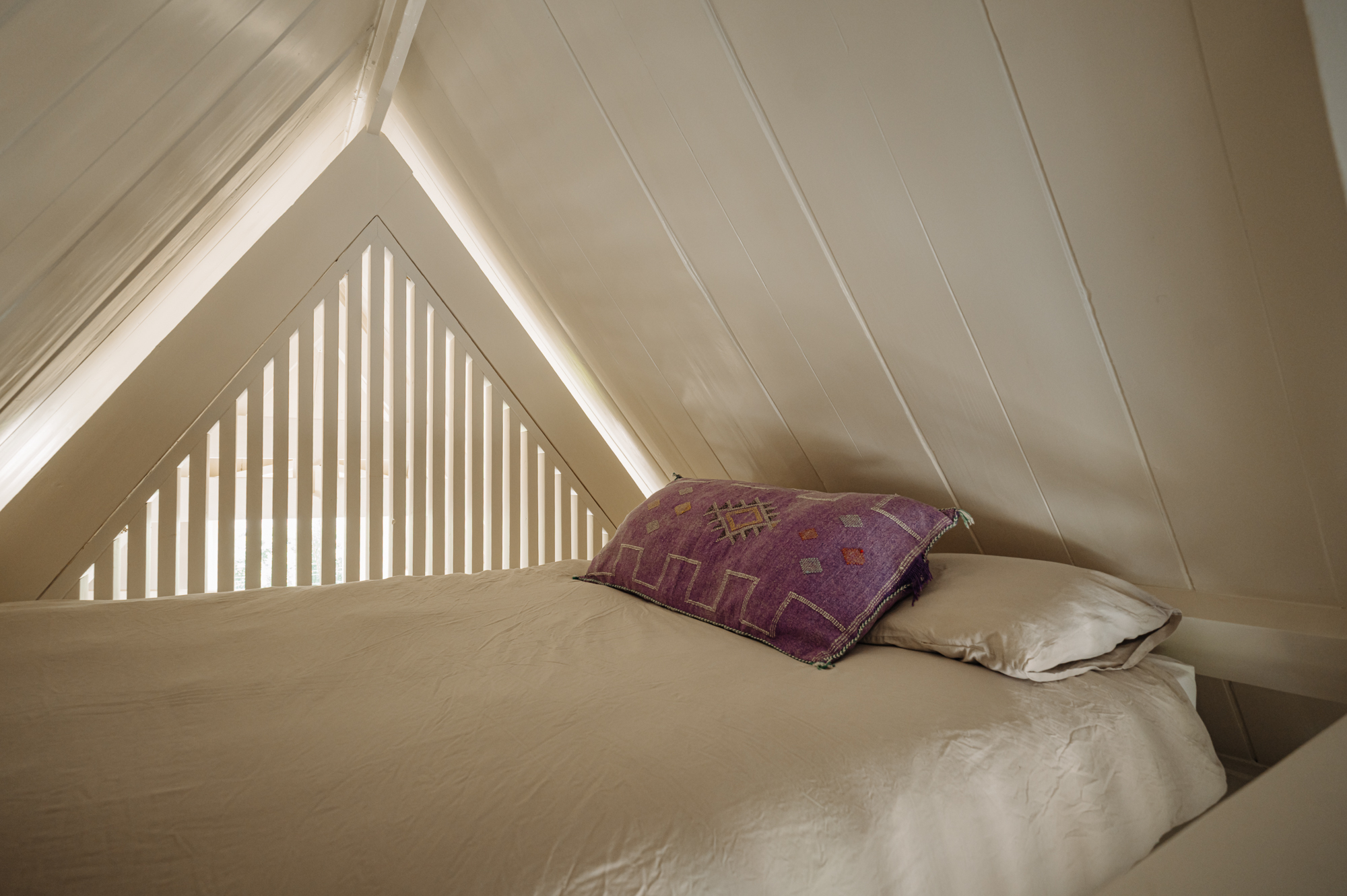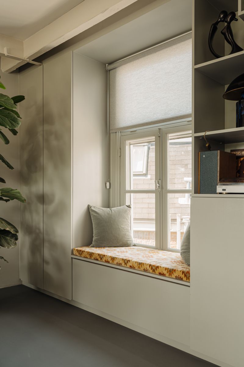 Op de vierde etage geven de zichtbare houten balken en de originele dakconstructie de woning extra sfeer. Aan de voorzijde ligt een slaapkamer met dakkapel, in het midden de badkamer met inloopdouche en wastafel, en aan de achterzijde een royale open ruimte met openslaande deuren naar het dakterras van circa 6 m². Deze ruimte is eenvoudig als tweede slaapkamer in te richten. Via een uitklapbare trap is een gezellige vide te bereiken voor opslag of als extra slaapplek.