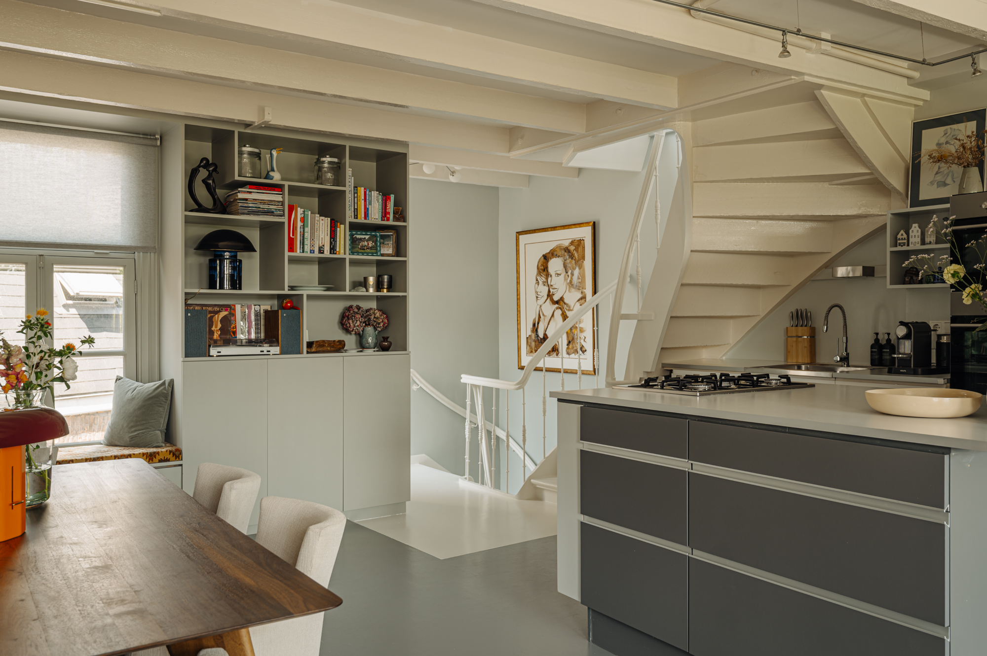 The private entrance to the apartment is located on the second floor. A small hallway with coat storage and a meter cupboard leads to the living floor on the third level. Here you'll find a spacious through-living room with three large windows at the front and beautiful, unobstructed views of the canal and trees. At the rear lies the open-plan kitchen (renovated in 2014), equipped with various built-in appliances. A hallway in the centre of this floor provides access to a separate toilet with a washbasin. A stylish open staircase leads to the upper sleeping quarters.