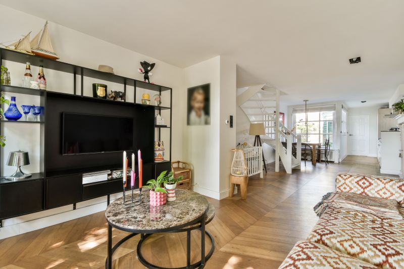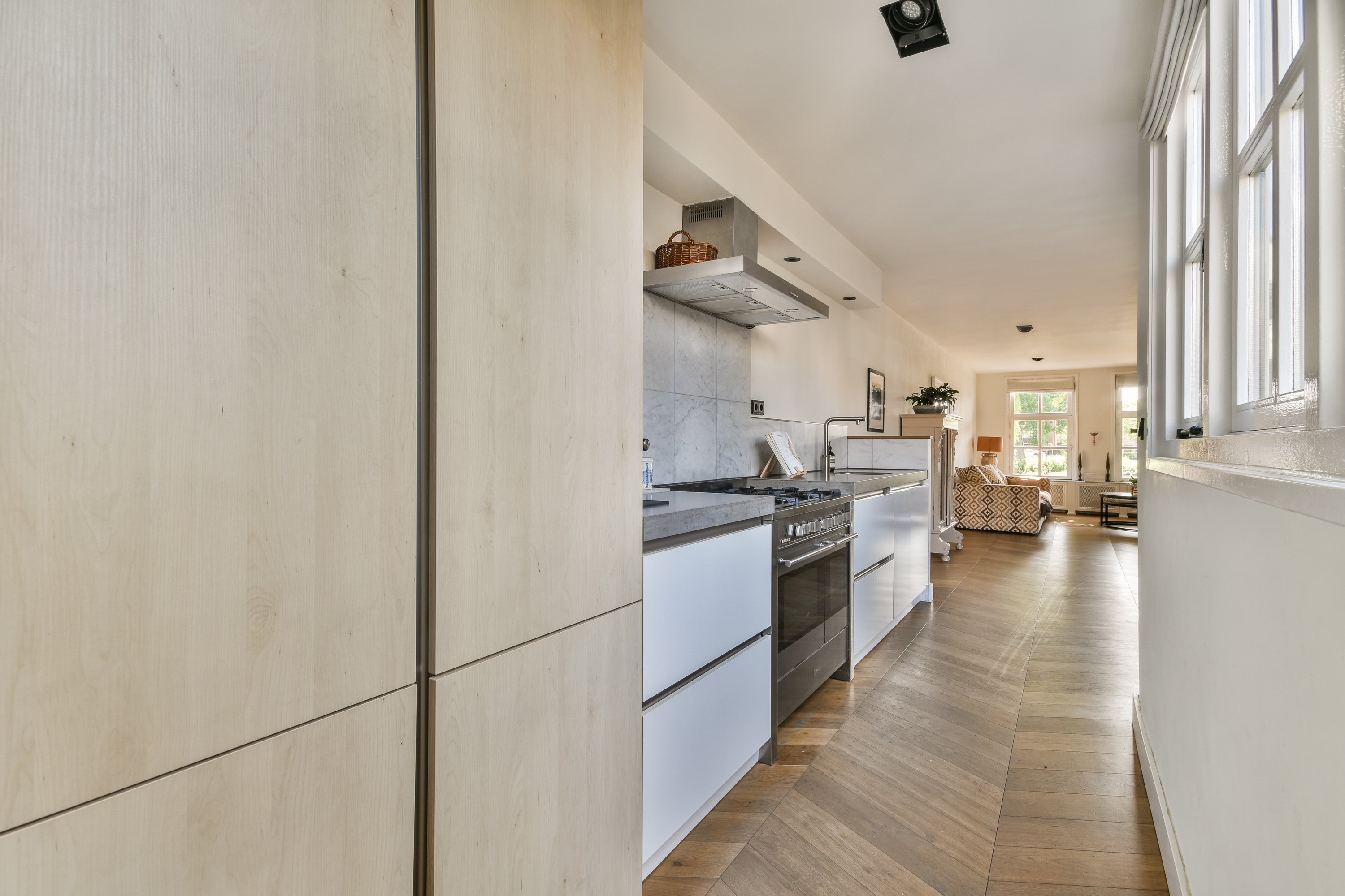 The entrance leads into a hallway with access to a cloakroom, a bedroom at the rear with access to the garden, a modern bathroom with a walk-in shower and double sink, and a separate toilet. At the front, you’ll find the atmospheric living room with large windows offering views over the Zaan and the harbor. The open kitchen at the rear is equipped with various built-in appliances, including a 6-burner gas stove with double oven, extractor hood, dishwasher, and fridge-freezer. The entire ground floor features a luxurious Hungarian-point oak floor.