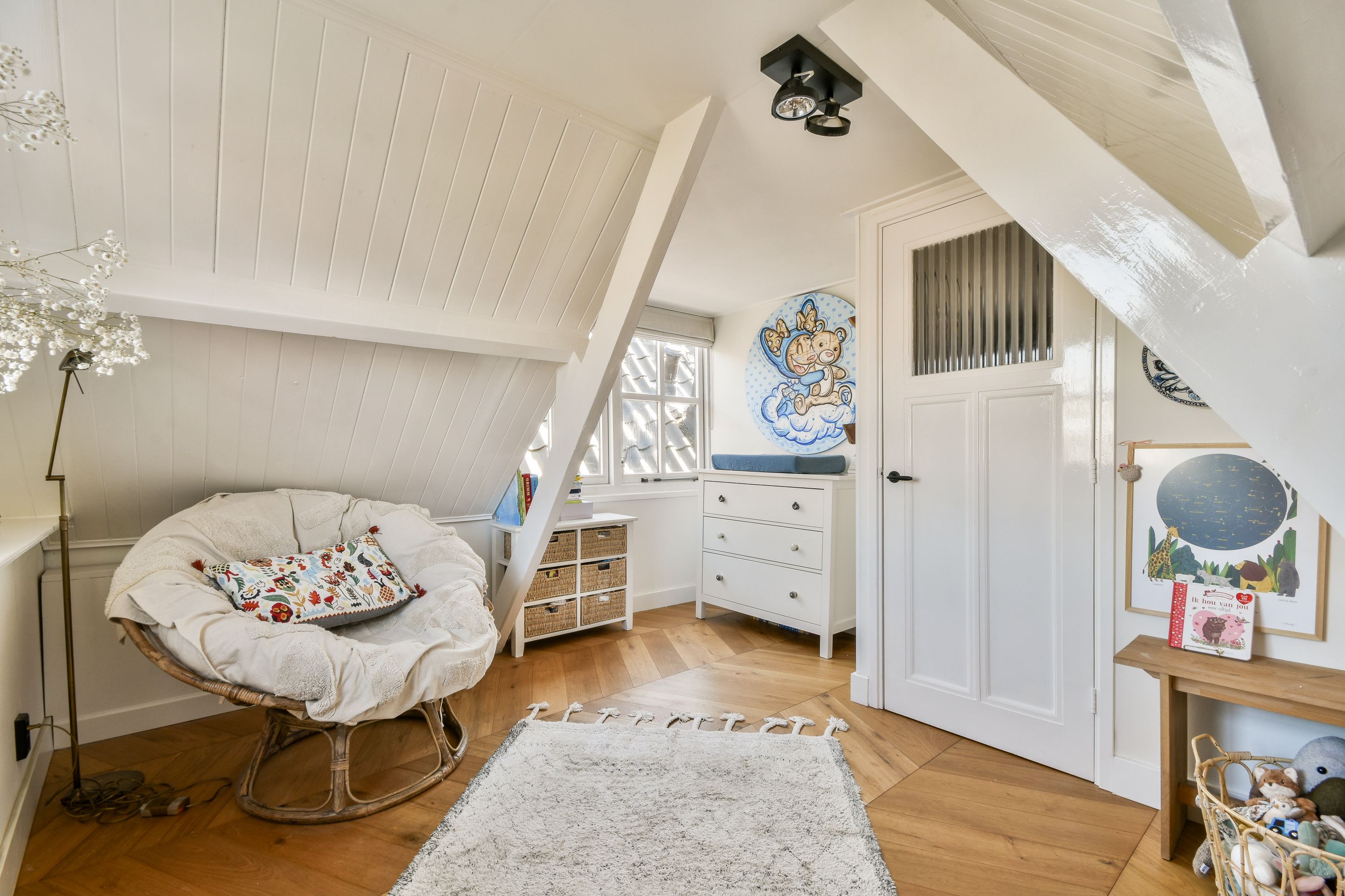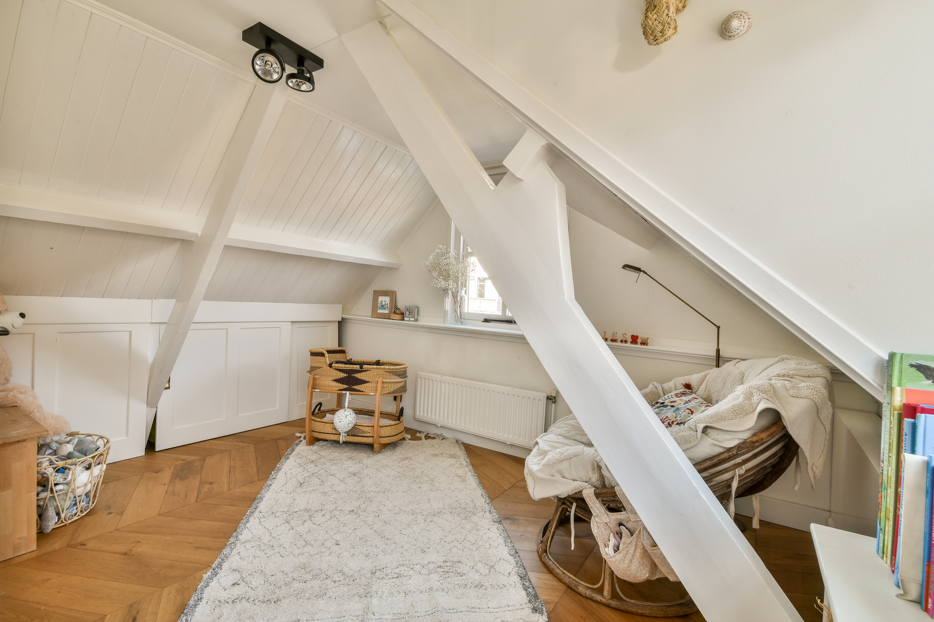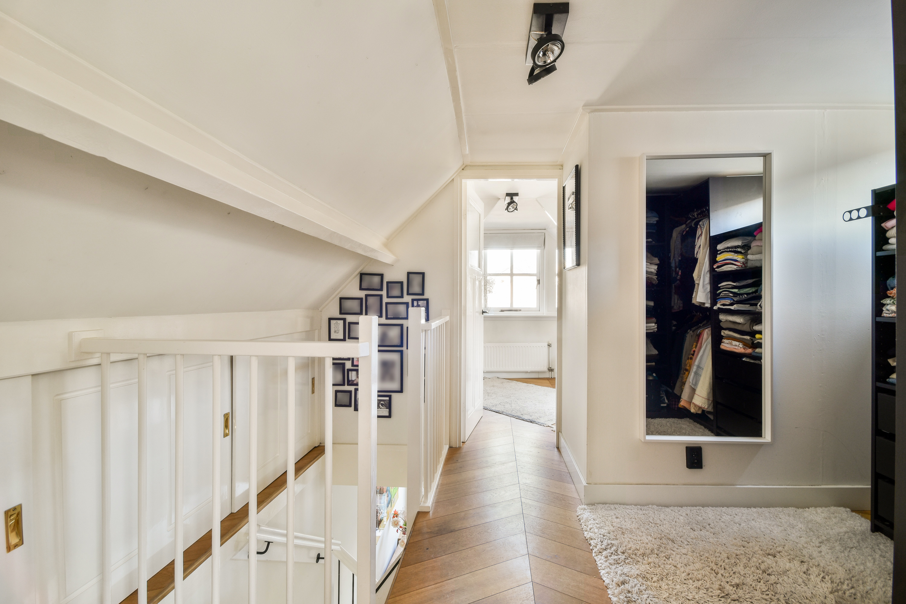 Op de eerste verdieping bevinden zich twee goed ingedeelde slaapkamers, beide voorzien van een dakkapel en praktische bergruimte onder de schuine kap. De kamer aan de voorzijde biedt schitterend zicht op het water, terwijl de overloop, thans in gebruik als inloopkast, ook uitstekend dienst kan doen als werkplek. Aan de achterzijde bevind zich nog een slaapkamer met uitzicht op de tuin