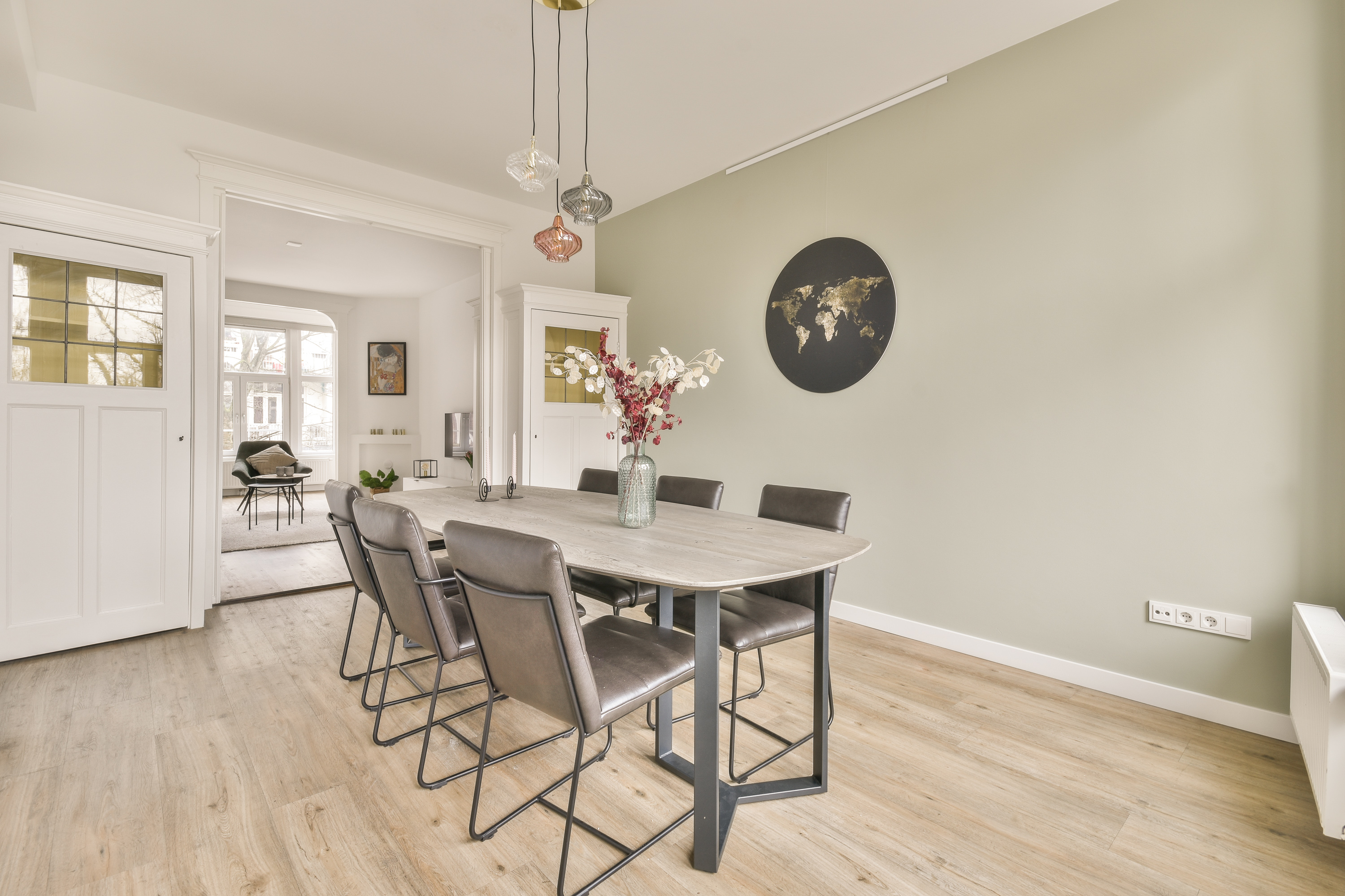 Via the well-maintained and classic staircase, you reach the entrance on the second floor. The spacious hall provides an elegant welcome and gives direct access to all rooms. The refined details immediately stand out here, such as the cut-glass stained-glass windows above the doors and the stylish hardware, which underscore the classic character of the home.