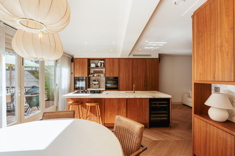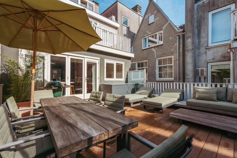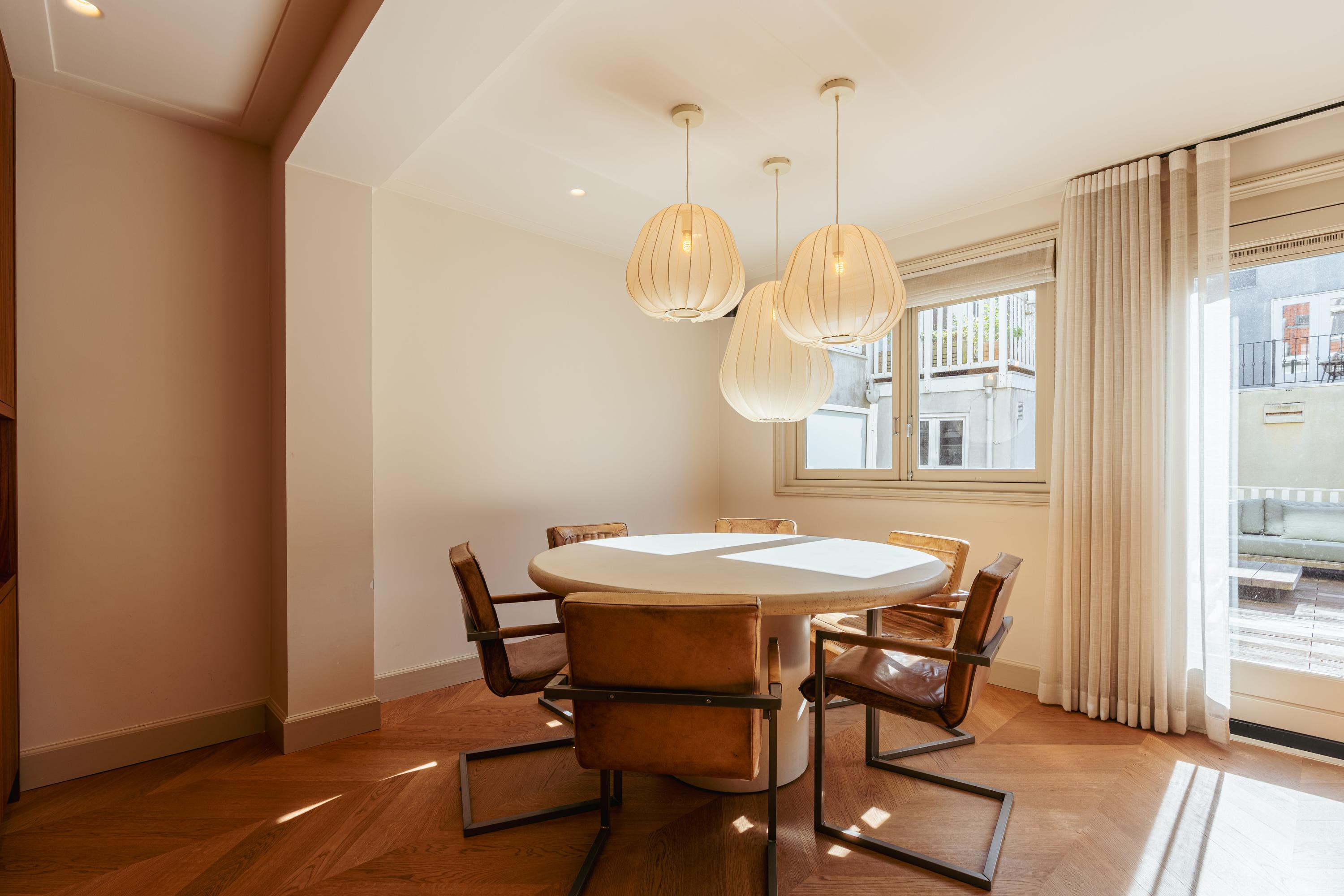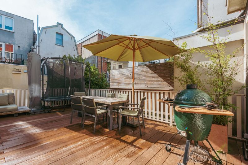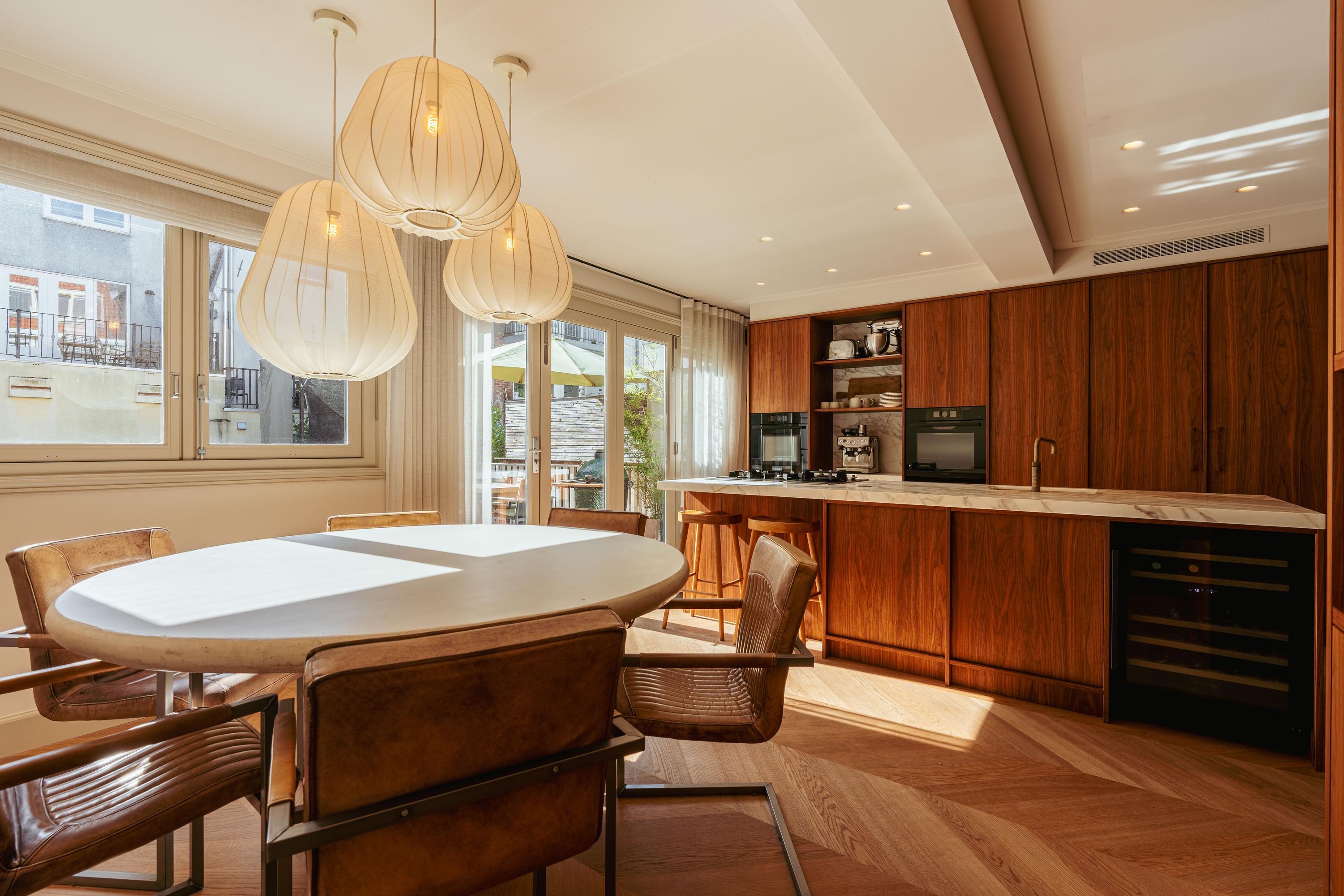 Spacious hallway with a coat closet and a separate toilet with a hand basin. You enter the spacious, light-filled living room, which, thanks to the windows at both the front and rear, is exceptionally bright and spacious. The custom-made built-in wardrobes add to the space's ambiance and functionality. The luxurious kitchen/diner is equipped with a stylish cooking island and high-quality built-in appliances, including a Quooker tap, a wine cooler, a gas cooktop with integrated extractor hood, two ovens, a dishwasher, a large refrigerator, and a separate freezer. The dining area opens onto the stunning 45 m² south-facing roof terrace, accessible through fully opening concertina doors, seamlessly blending indoors and outdoors.