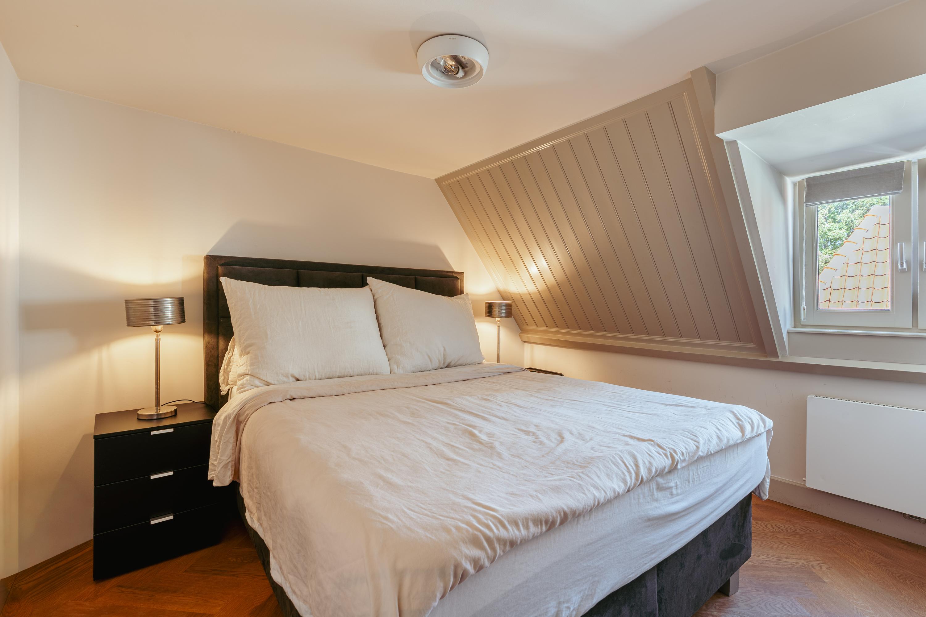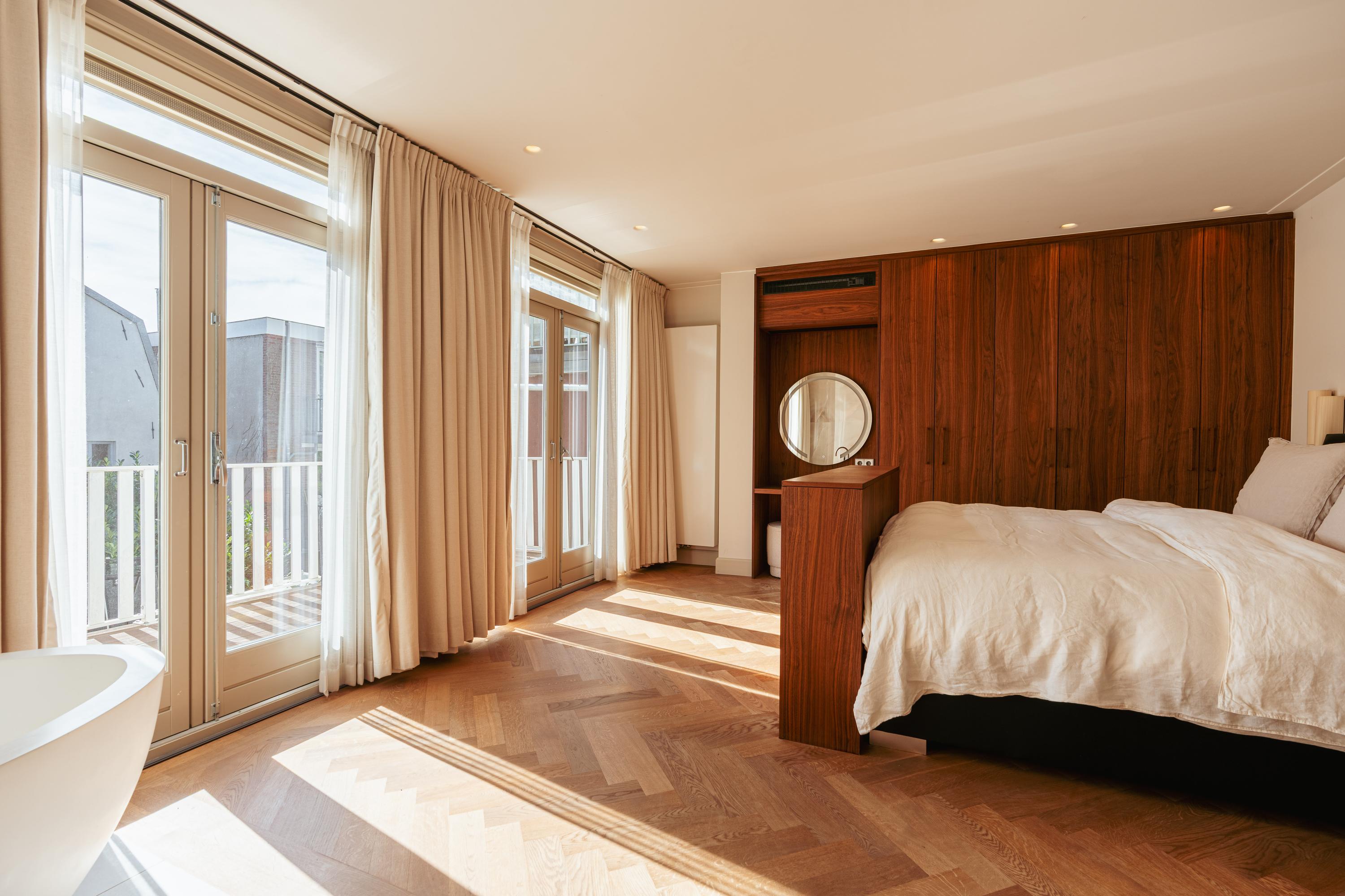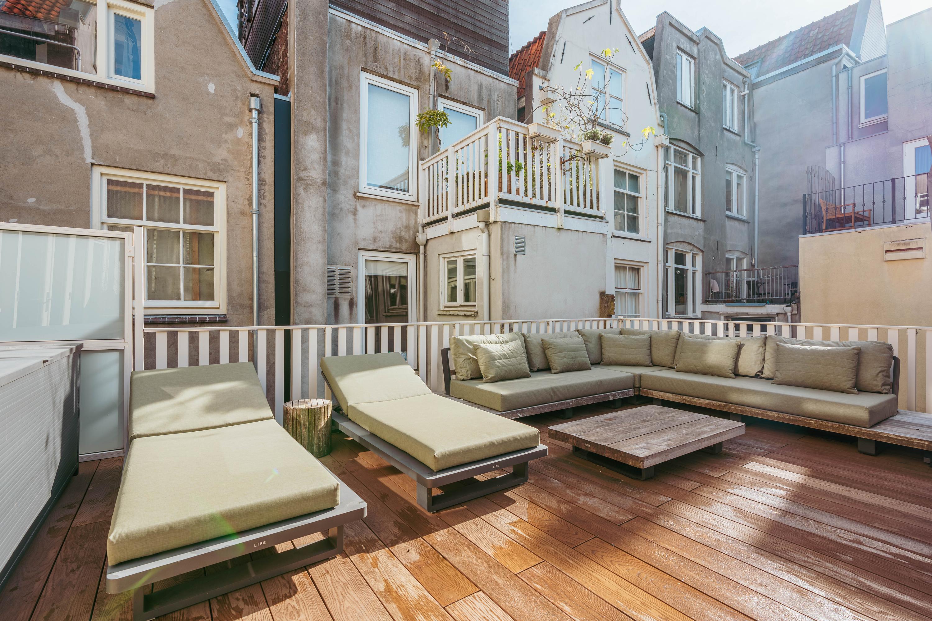 Ruime hal met garderobe en een separate WC met fonteintje. U komt binnen in de royale doorzonwoonkamer, die door de raampartijen aan zowel de voor- als achterzijde een uitzonderlijk licht en ruimtelijk karakter heeft. De op maat gemaakte inbouwkasten geven de ruimte extra sfeer en functionaliteit. De luxe woonkeuken is uitgerust met een stijlvol kookeiland en hoogwaardige inbouwapparatuur, waaronder een Quooker-kraan, een wijnklimaatkast, een gaskookplaat met geïntegreerde afzuiging, twee ovens, een afwasmachine, een grote koelkast en een aparte vriezer. Het eetgedeelte grenst aan het waanzinnige dakterras van maar liefst 45 m2 op het zuiden, dat via de geheel te openen harmonicadeuren bereikbaar is, waardoor binnen en buiten naadloos in elkaar overlopen.