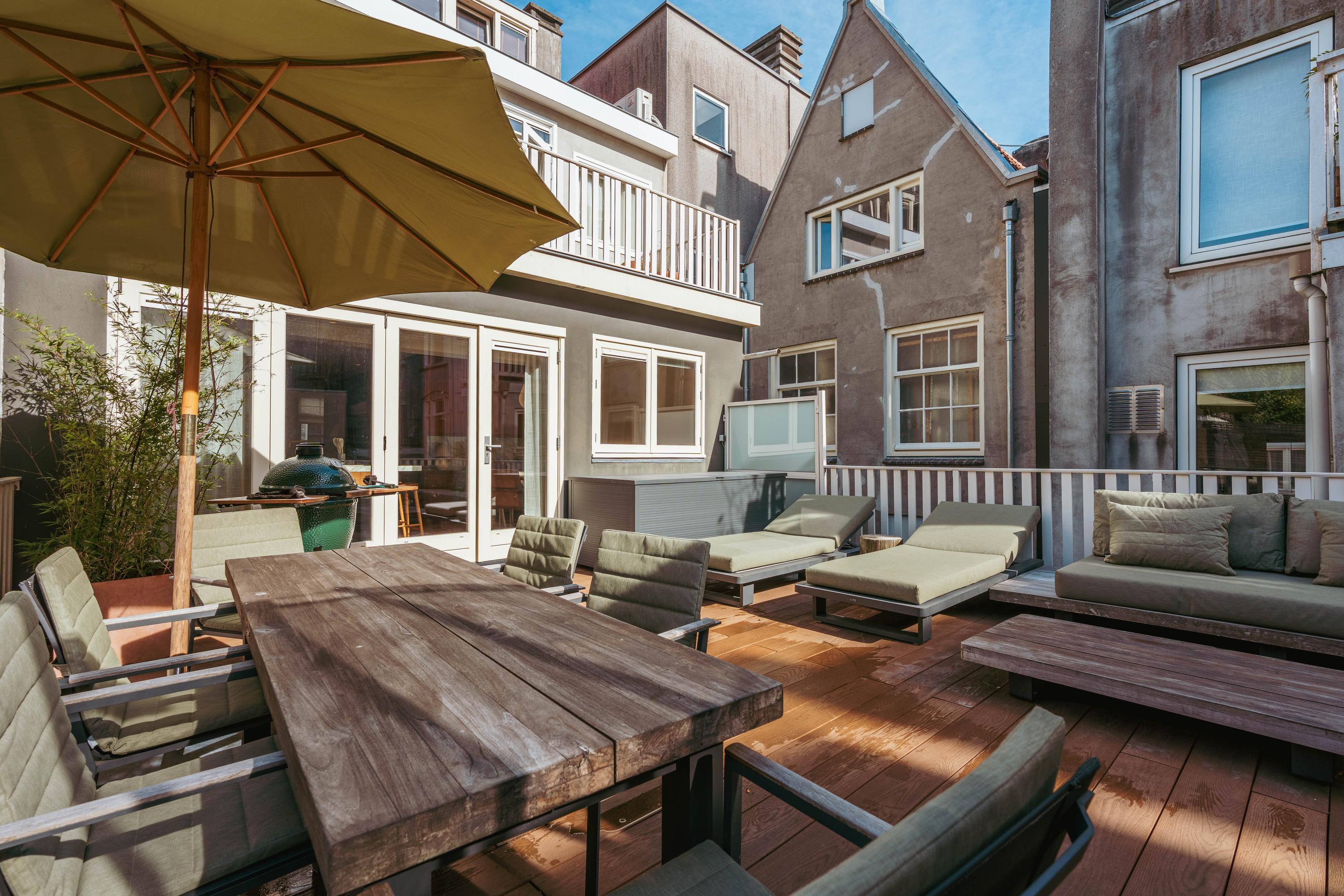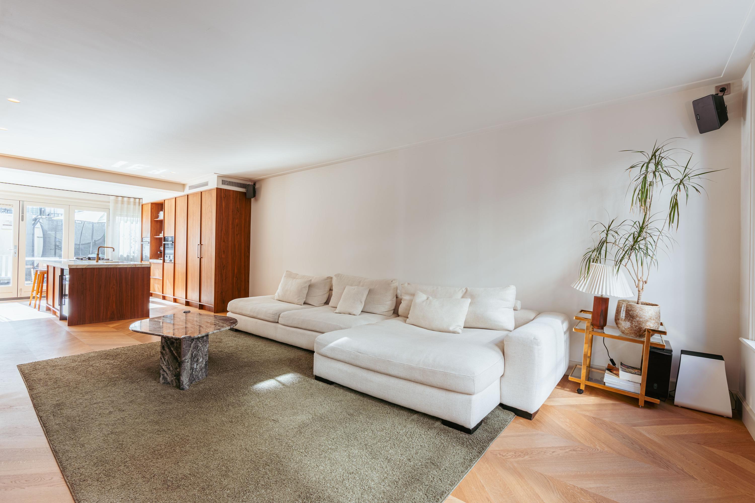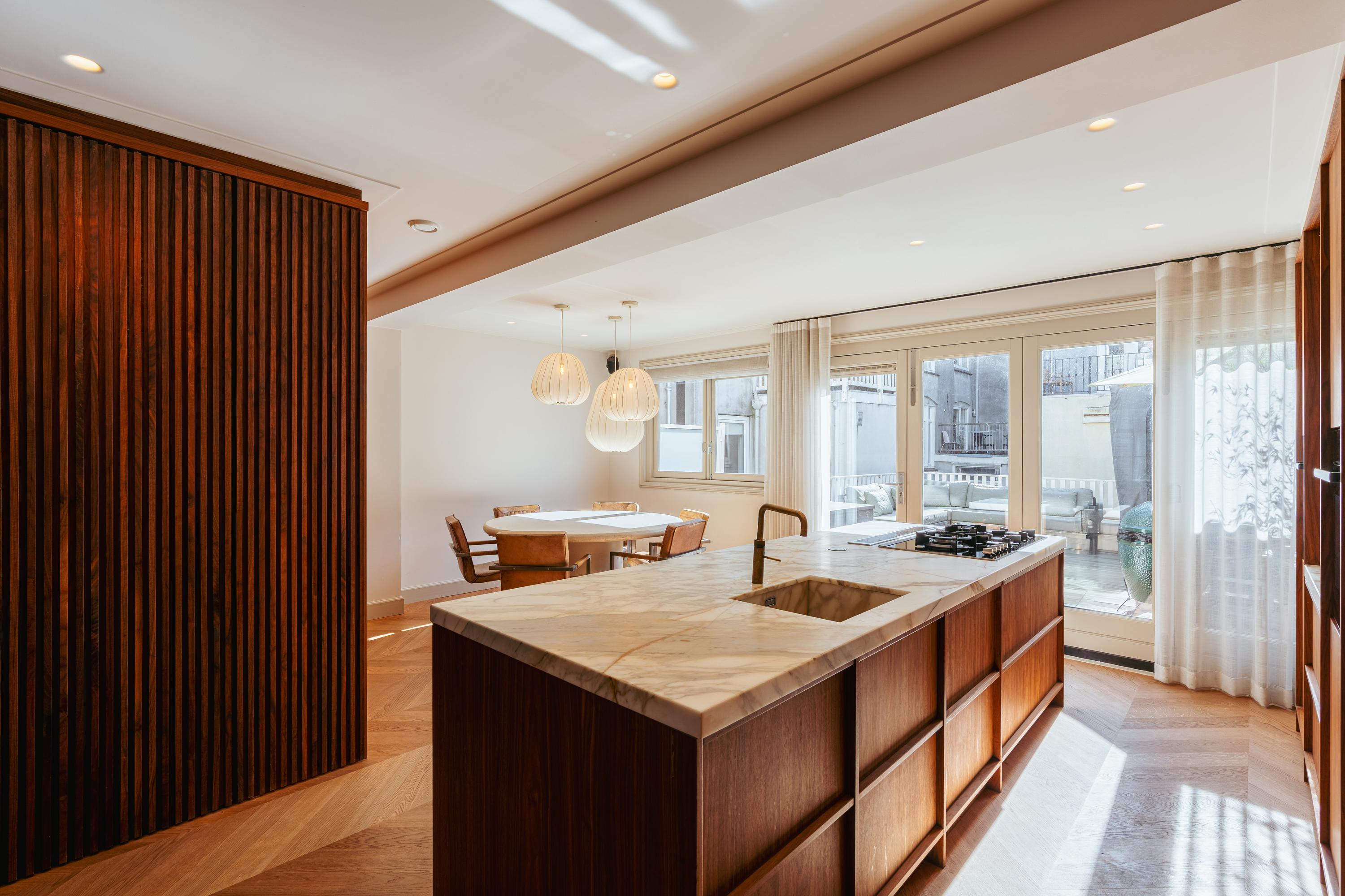 Private entrance from the street to the first floor, leading to the spacious hall with a wardrobe and a separate WC with a washbasin. You enter the generous living room, which has an exceptionally light and spacious character thanks to the windows at both the front and rear. The custom-made built-in cupboards add extra atmosphere and functionality to the room. The luxurious eat-in kitchen is equipped with a stylish kitchen island and high-quality built-in appliances, including a Quooker tap, a wine cooler, a gas hob with integrated extractor hood, two ovens, a dishwasher, a large refrigerator, and a separate freezer. The dining area adjoins the amazing south-facing roof terrace of no less than 45 m², which is accessible via the fully opening folding doors, allowing the interior and exterior to flow seamlessly into one another.