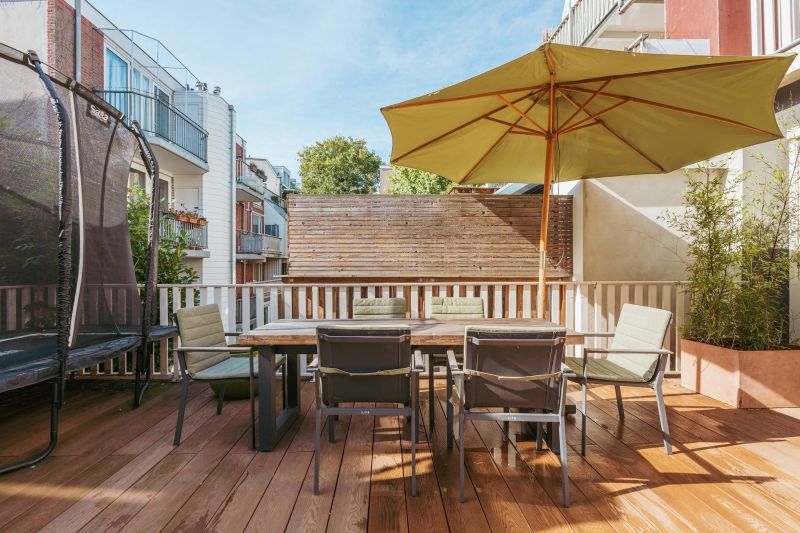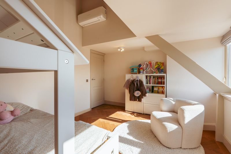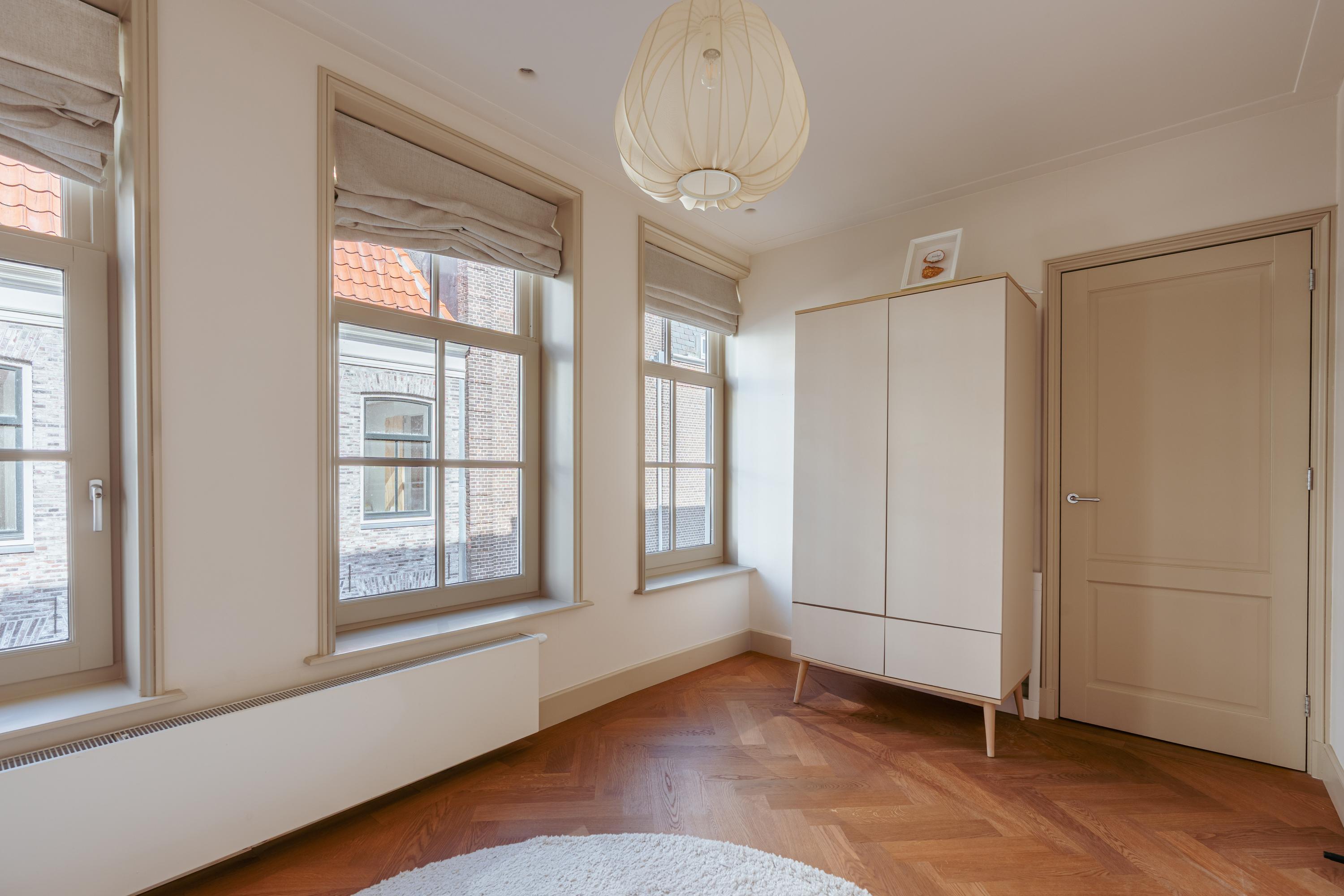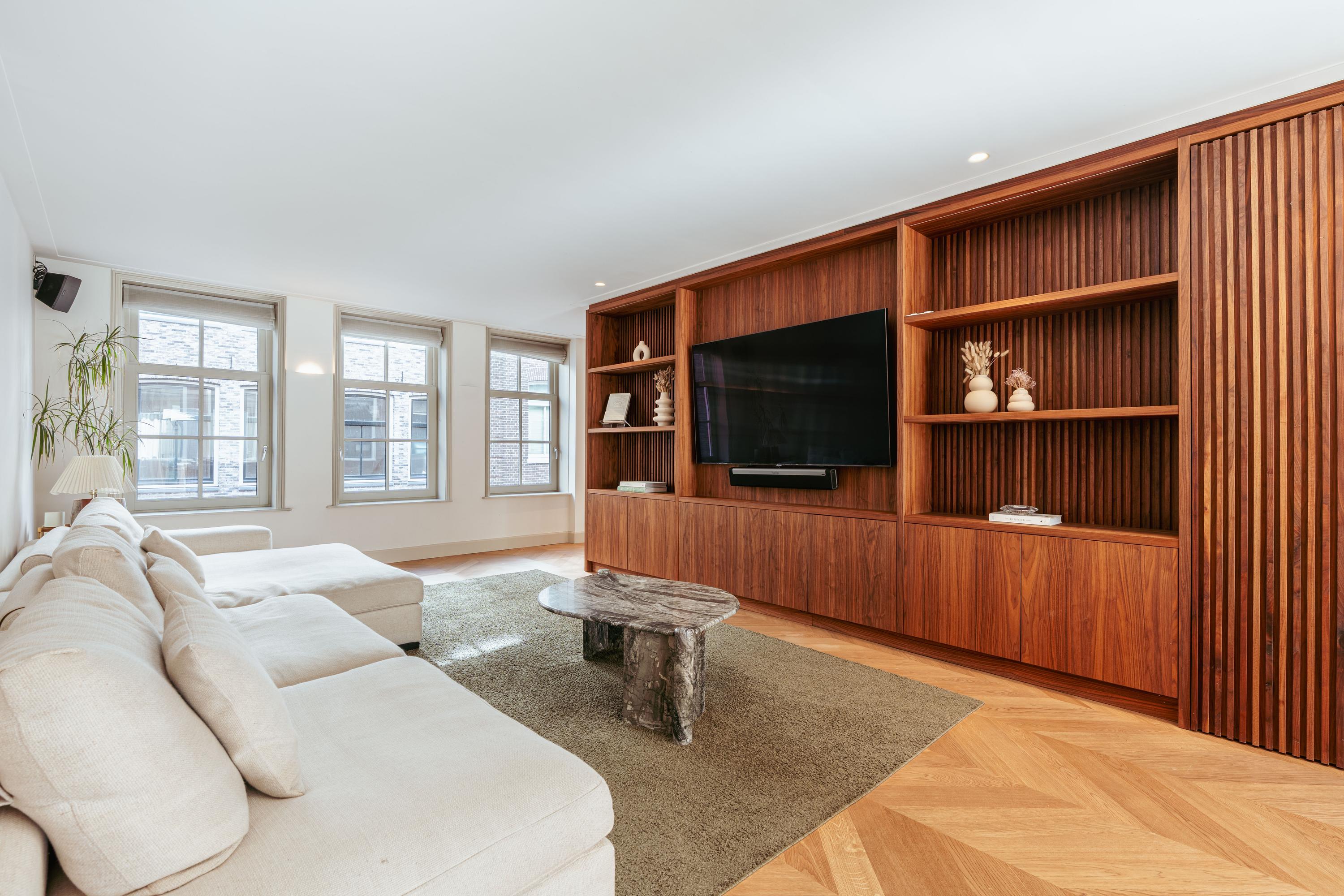 Private entrance from the street to the first floor, leading to the spacious hall with a wardrobe and a separate WC with a washbasin. You enter the generous living room, which has an exceptionally light and spacious character thanks to the windows at both the front and rear. The custom-made built-in cupboards add extra atmosphere and functionality to the room. The luxurious eat-in kitchen is equipped with a stylish kitchen island and high-quality built-in appliances, including a Quooker tap, a wine cooler, a gas hob with integrated extractor hood, two ovens, a dishwasher, a large refrigerator, and a separate freezer. The dining area adjoins the amazing south-facing roof terrace of no less than 45 m², which is accessible via the fully opening folding doors, allowing the interior and exterior to flow seamlessly into one another.