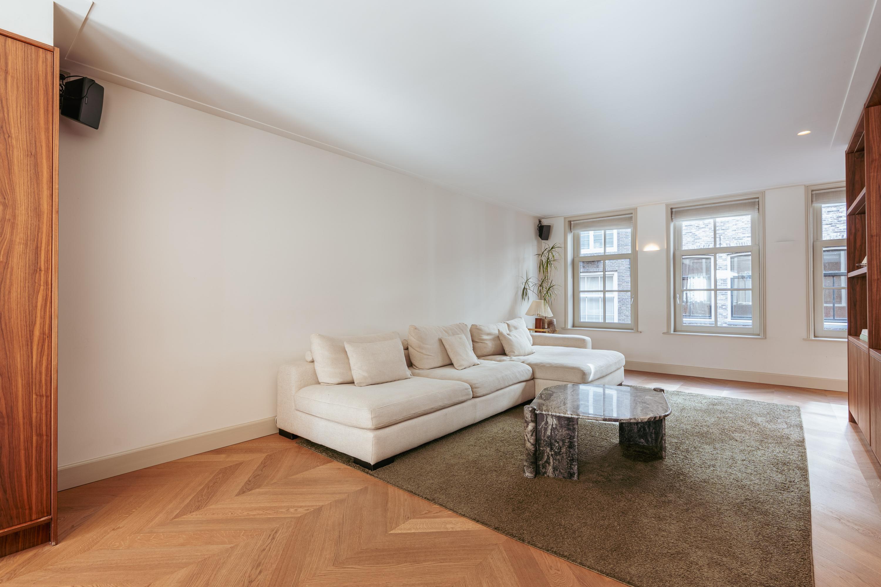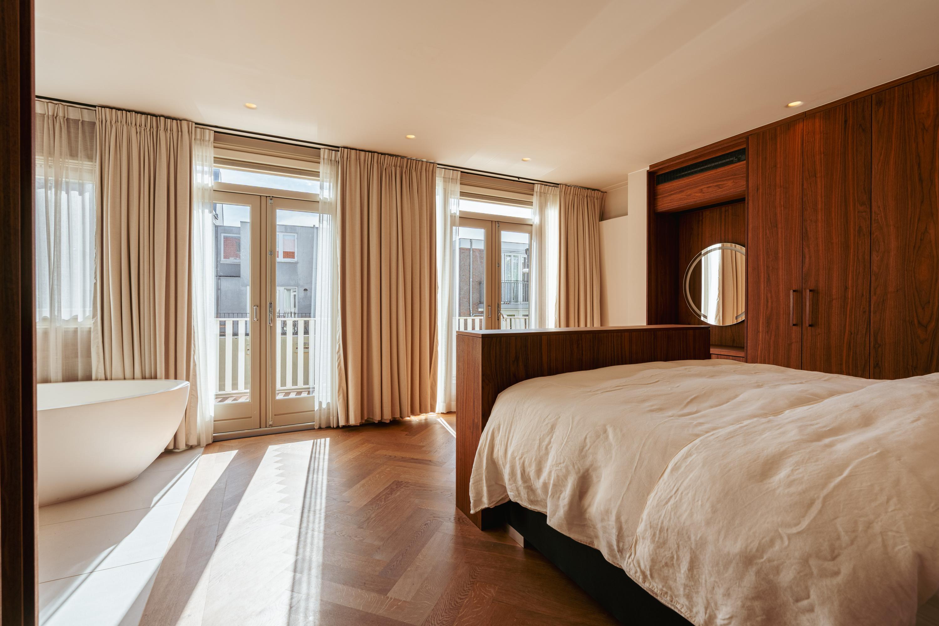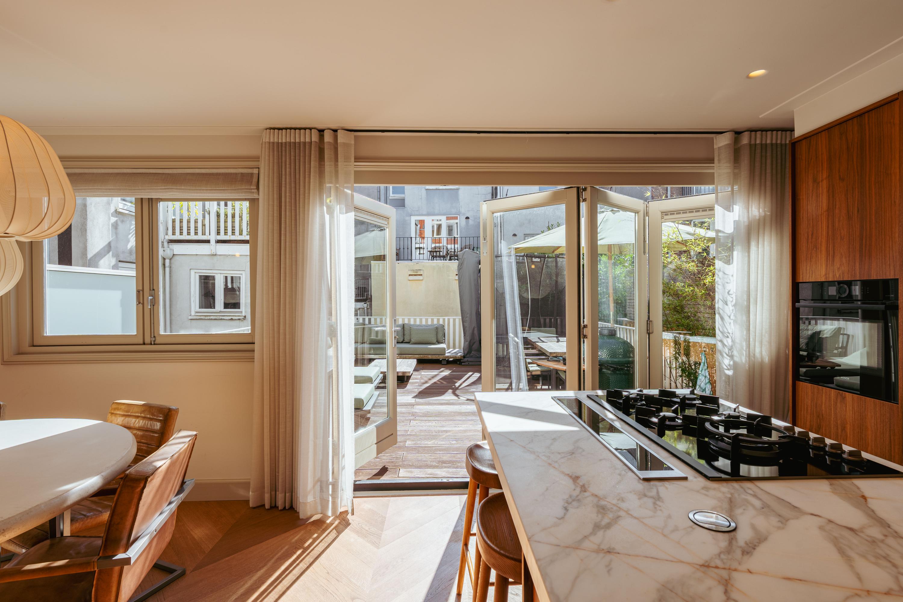 Eigen entree vanaf de straat naar de eerste verdieping naar de ruime hal met garderobe en een separate WC met fonteintje. U komt binnen in de royale doorzonwoonkamer, die door de raampartijen aan zowel de voor- als achterzijde een uitzonderlijk licht en ruimtelijk karakter heeft. De op maat gemaakte inbouwkasten geven de ruimte extra sfeer en functionaliteit. De luxe woonkeuken is uitgerust met een stijlvol kookeiland en hoogwaardige inbouwapparatuur, waaronder een Quooker-kraan, een wijnklimaatkast, een gaskookplaat met geïntegreerde afzuiging, twee ovens, een afwasmachine, een grote koelkast en een aparte vriezer. Het eetgedeelte grenst aan het waanzinnige dakterras van maar liefst 45 m2 op het zuiden, dat via de geheel te openen harmonicadeuren bereikbaar is, waardoor binnen en buiten naadloos in elkaar overlopen.