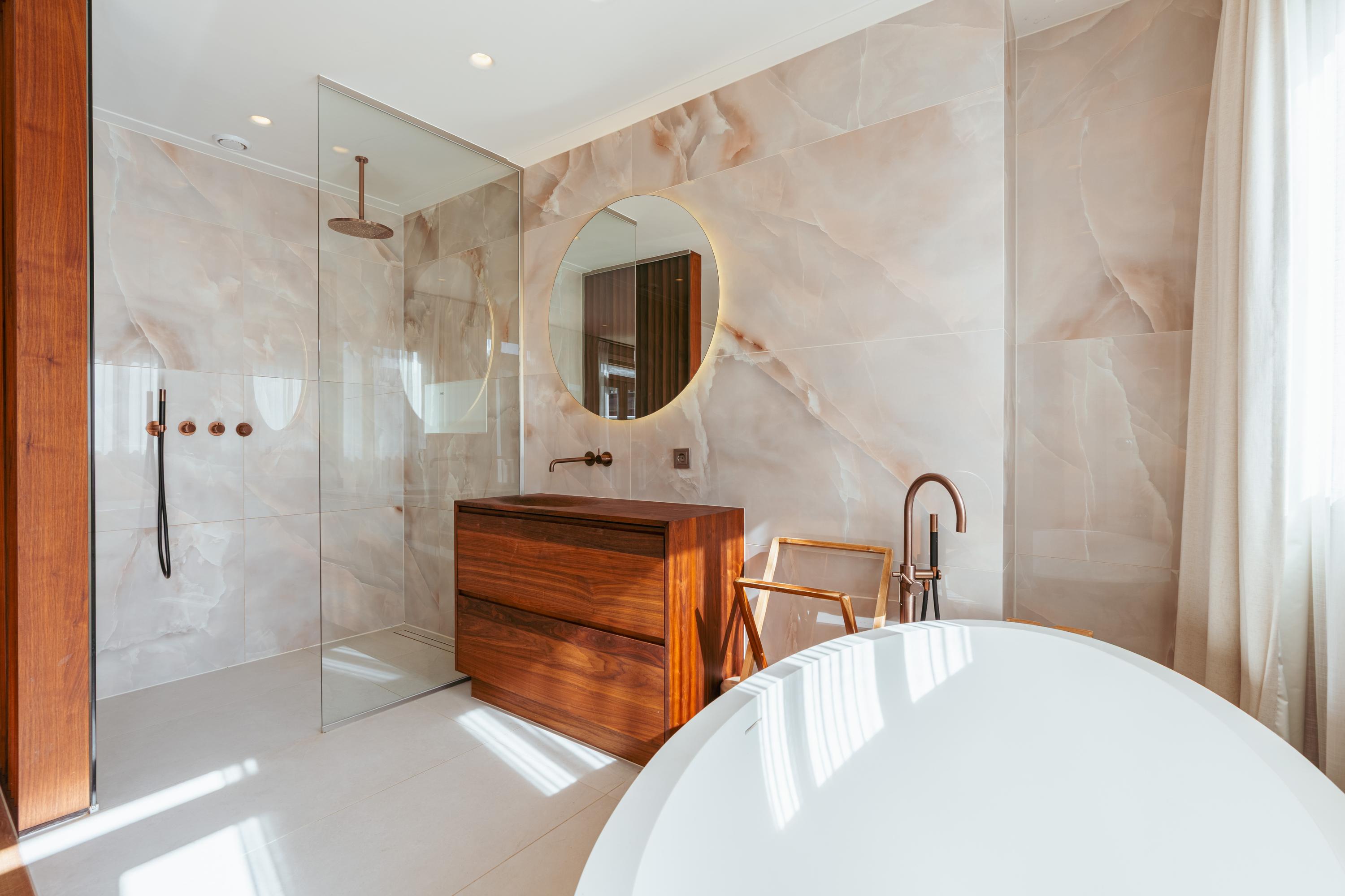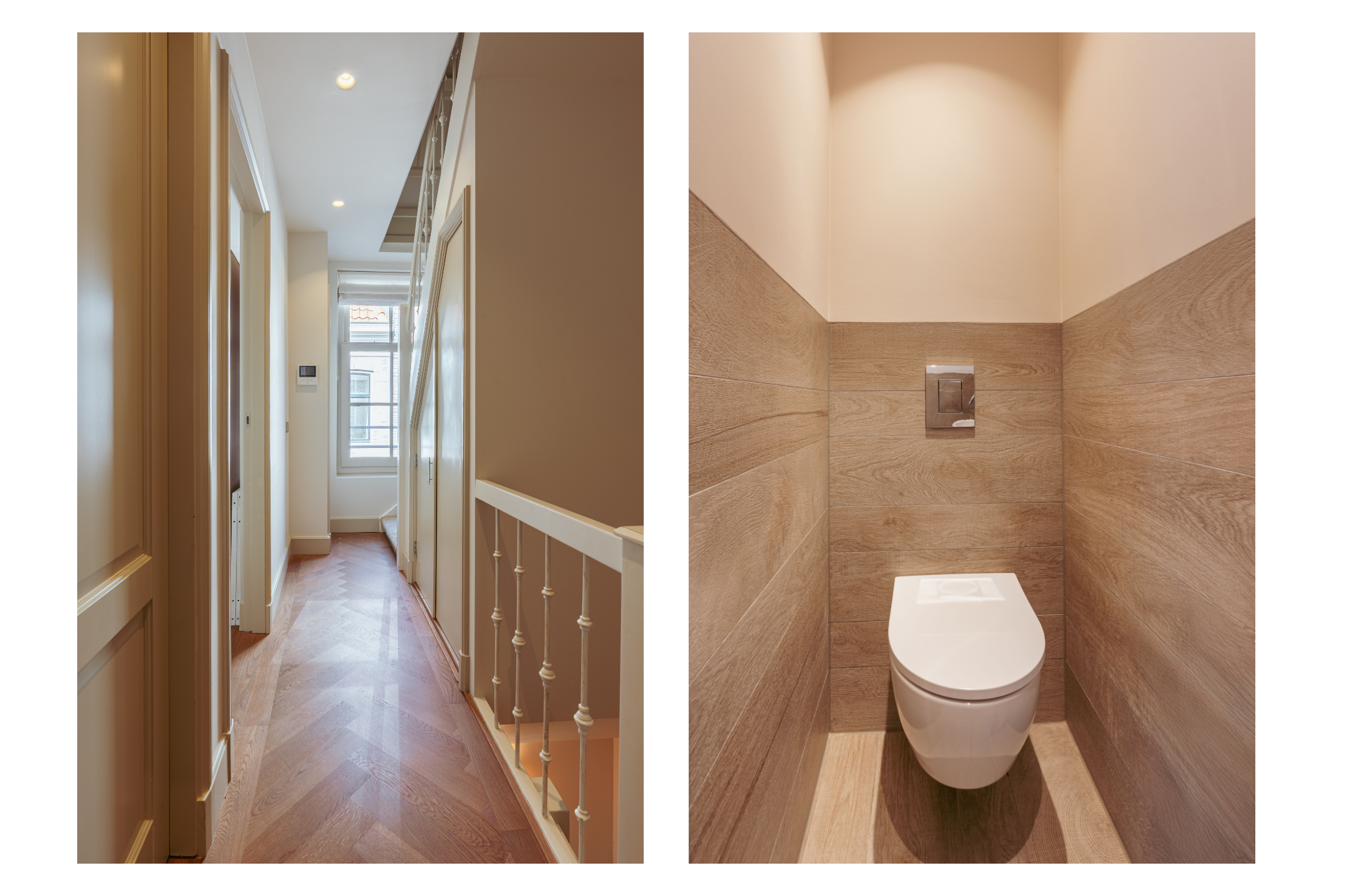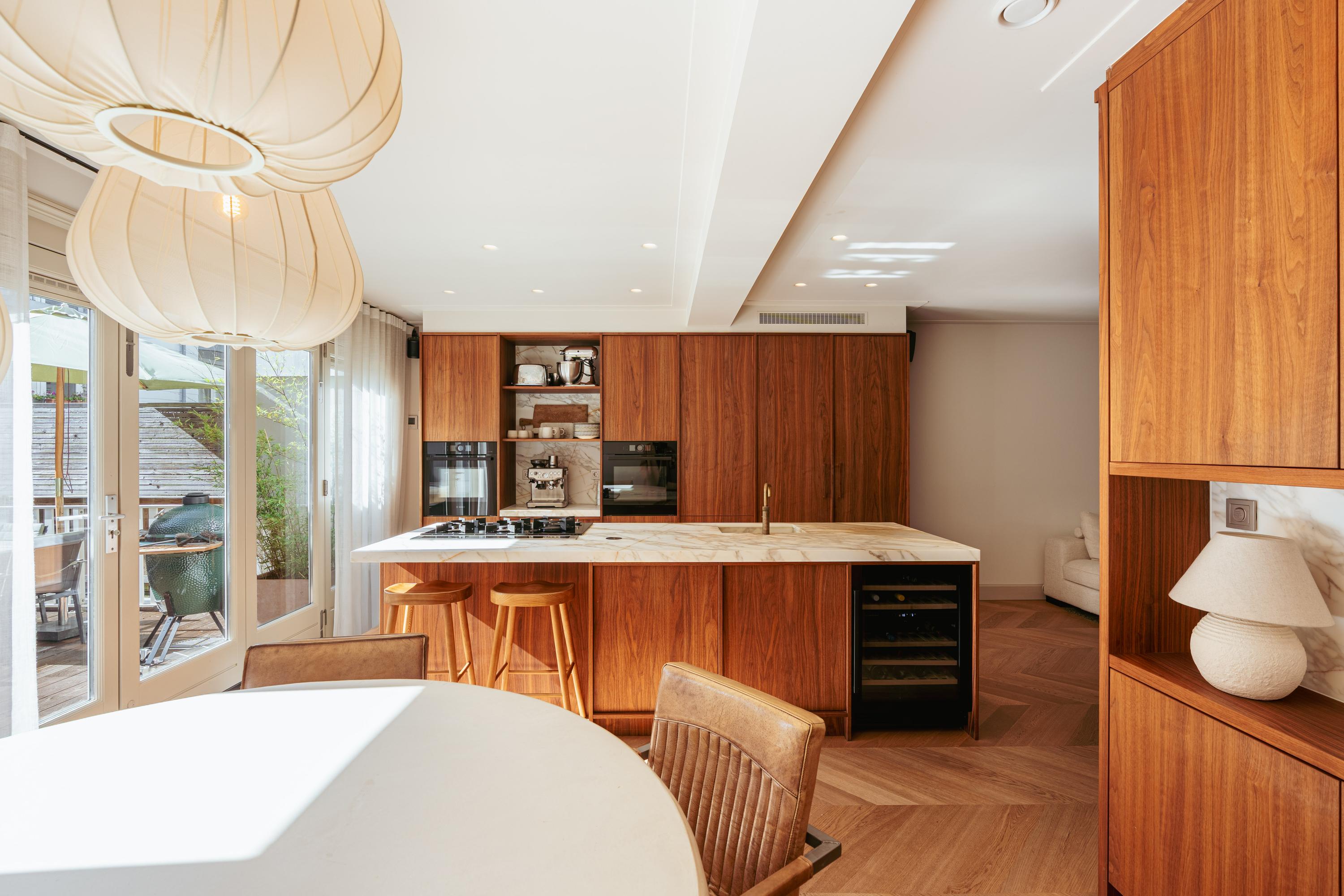 Eigen entree vanaf de straat naar de eerste verdieping naar de ruime hal met garderobe en een separate WC met fonteintje. U komt binnen in de royale doorzonwoonkamer, die door de raampartijen aan zowel de voor- als achterzijde een uitzonderlijk licht en ruimtelijk karakter heeft. De op maat gemaakte inbouwkasten geven de ruimte extra sfeer en functionaliteit. De luxe woonkeuken is uitgerust met een stijlvol kookeiland en hoogwaardige inbouwapparatuur, waaronder een Quooker-kraan, een wijnklimaatkast, een gaskookplaat met geïntegreerde afzuiging, twee ovens, een afwasmachine, een grote koelkast en een aparte vriezer. Het eetgedeelte grenst aan het waanzinnige dakterras van maar liefst 45 m2 op het zuiden, dat via de geheel te openen harmonicadeuren bereikbaar is, waardoor binnen en buiten naadloos in elkaar overlopen.
