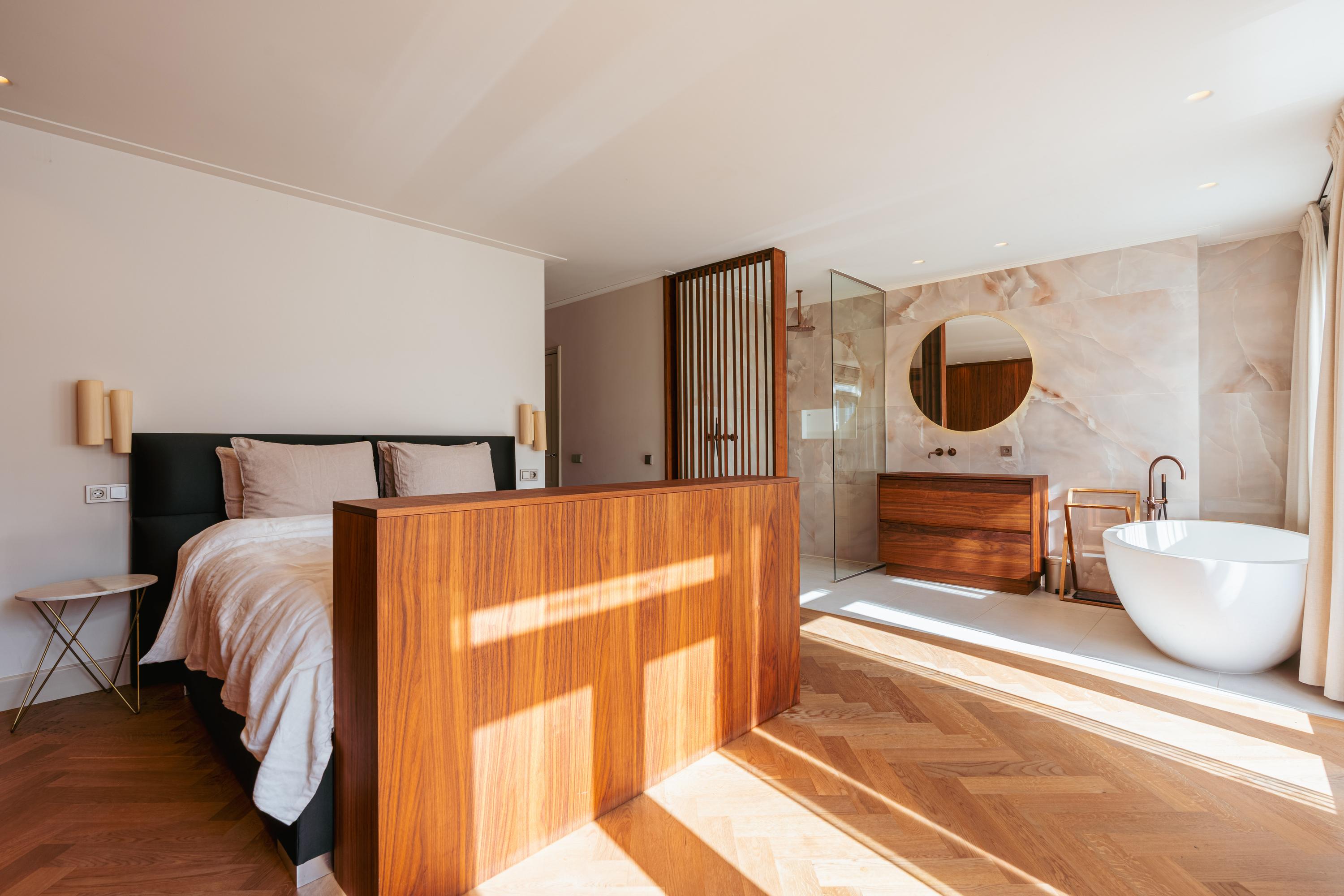 Op de overloop bevindt zich een ingebouwde kast met ruimte voor een wasmachine en droger. Er is een separate WC met fonteintje. De master bedroom met op maat gemaakte inloopkast is gelegen aan de achterzijde en heeft een badkamer ensuite die beschikt over een ligbad, inloopdouche en wastafel. De openslaande deuren geven toegang tot het balkon gelegen op het zuiden. Aan de voorzijde is nog een goed bemeten slaapkamer gelegen.