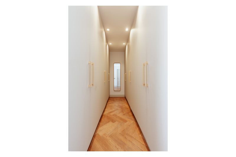 On the landing, there is a built-in cupboard with space for a washing machine and dryer. There is a separate WC with a washbasin. The master bedroom with a custom-made walk-in closet is located at the rear and features an en-suite bathroom equipped with a bathtub, walk-in shower, and washbasin. French doors provide access to the south-facing balcony. Another good-sized bedroom is located at the front.