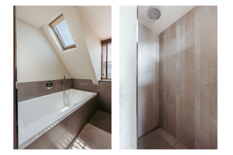 Three bedrooms are located on this floor. The bathroom is equipped with a bathtub, walk-in shower, double washbasin, and toilet. On the landing, a loft ladder provides access to the attic, perfect for extra storage space. The central heating boiler is located here.
