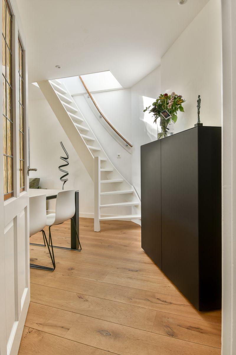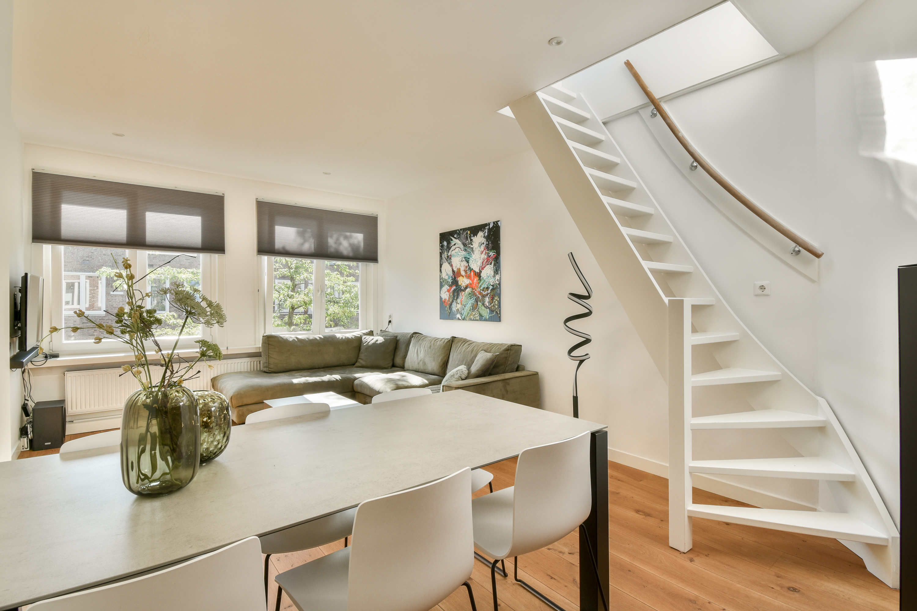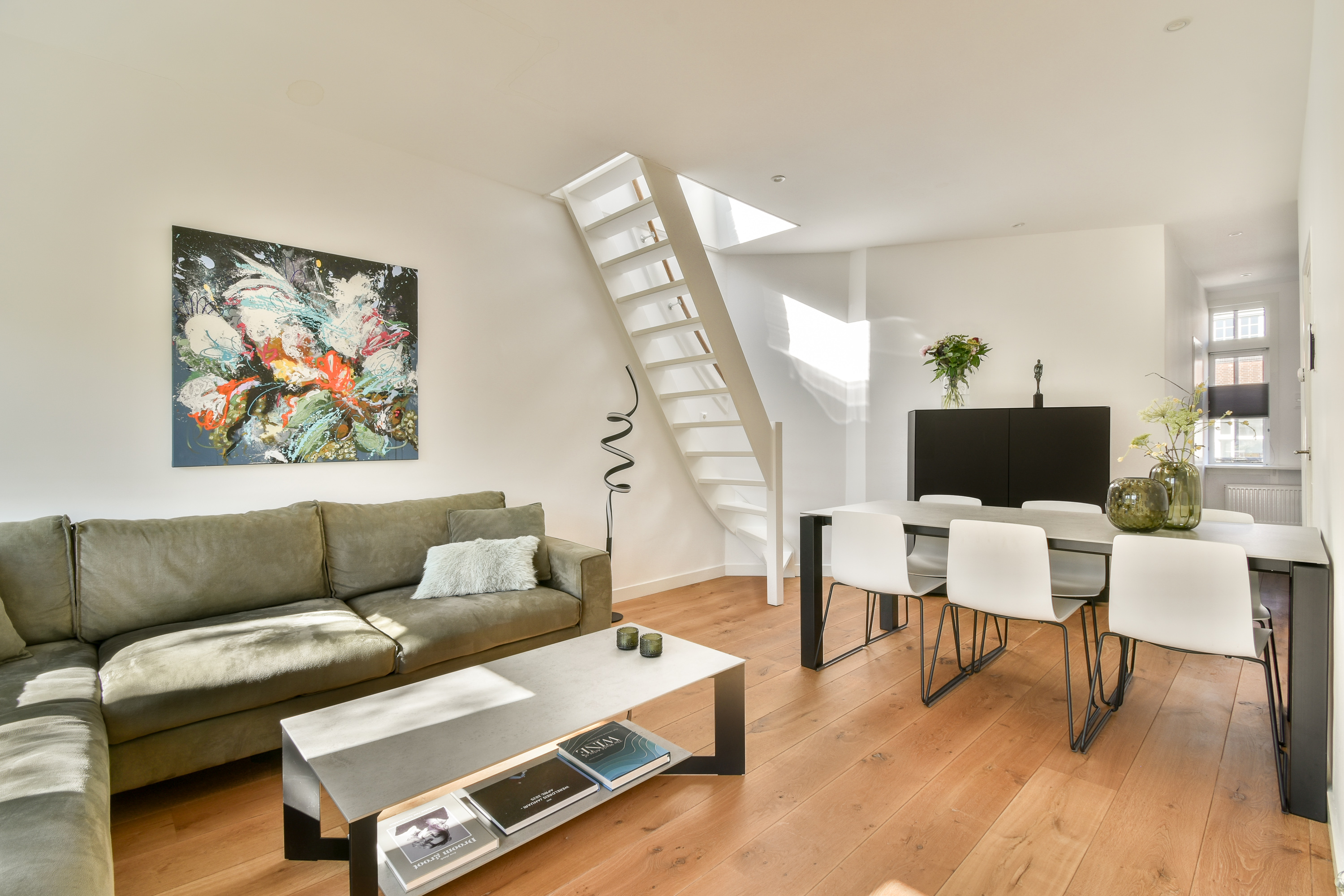 Via the staircase you reach the entrance of this lovely apartment on the third floor. In the hall there is space to hang your coats and the bathroom is located. The neat bathroom has a sink, shower and a toilet. At the front is the cozy, bright living room. From the living room there is access with a fixed staircase to the roof terrace. The lovely spacious roof terrace is approx. 28 m2. Next to the living room you will find a flexible space that can be used as a study/work room or as a 2nd bedroom. At the rear of the apartment is the kitchen and a spacious bedroom. The kitchen is equipped with a combi oven, refrigerator, dishwasher, 4-burner gas stove, Quooker and a sink (built-in appliances from Siemens). In addition to the roof terrace, you also have access to a balcony facing west from the bedroom and the kitchen.