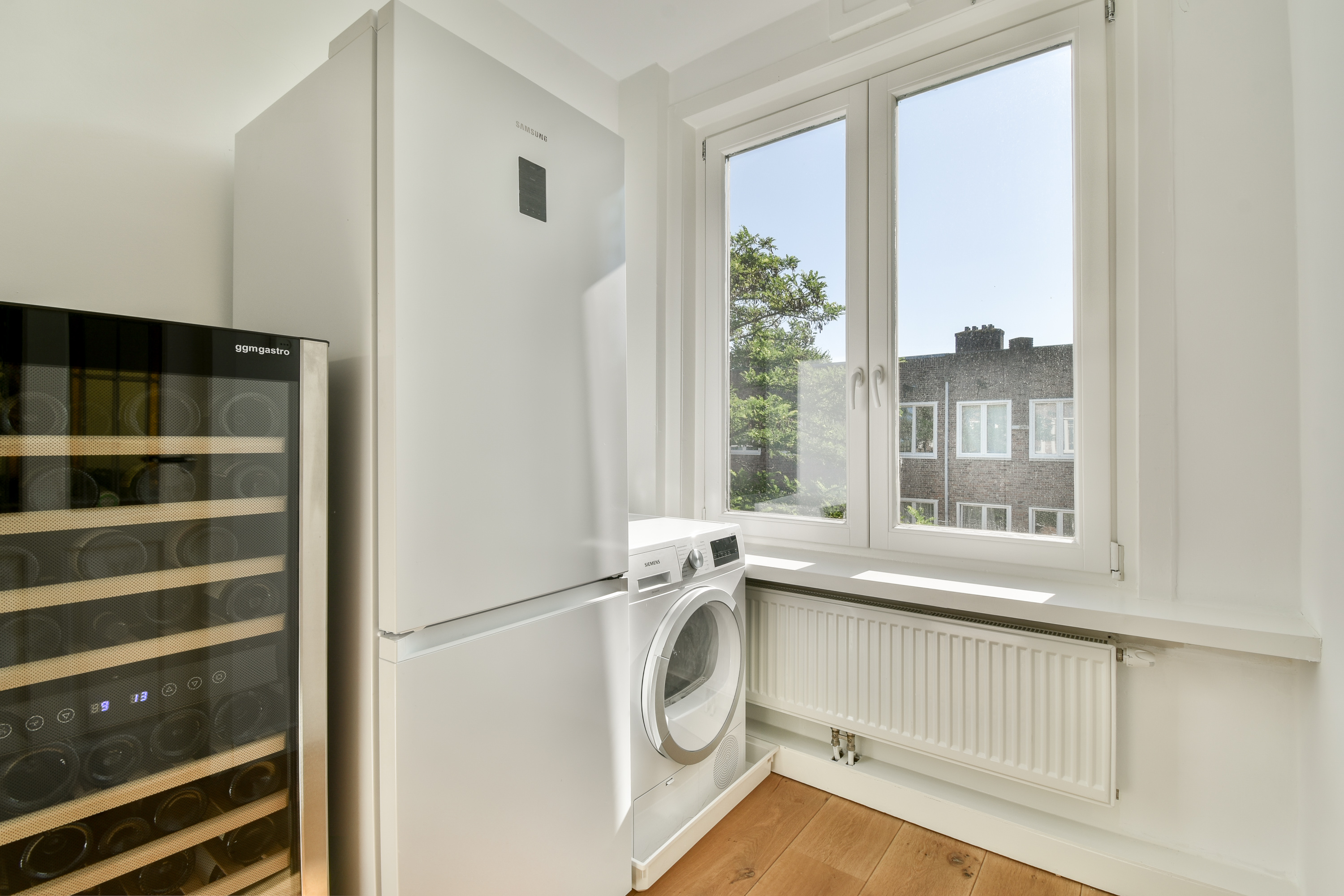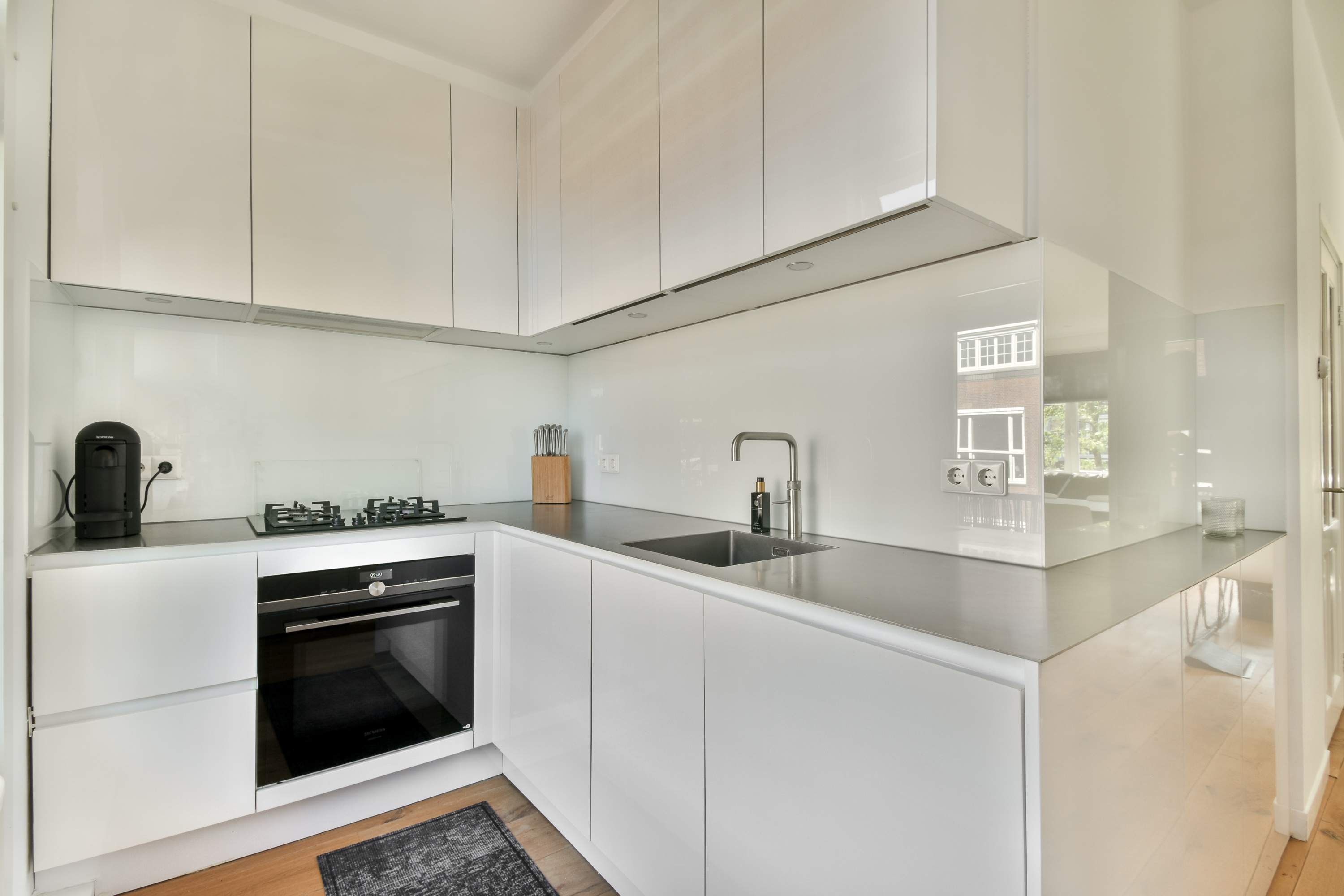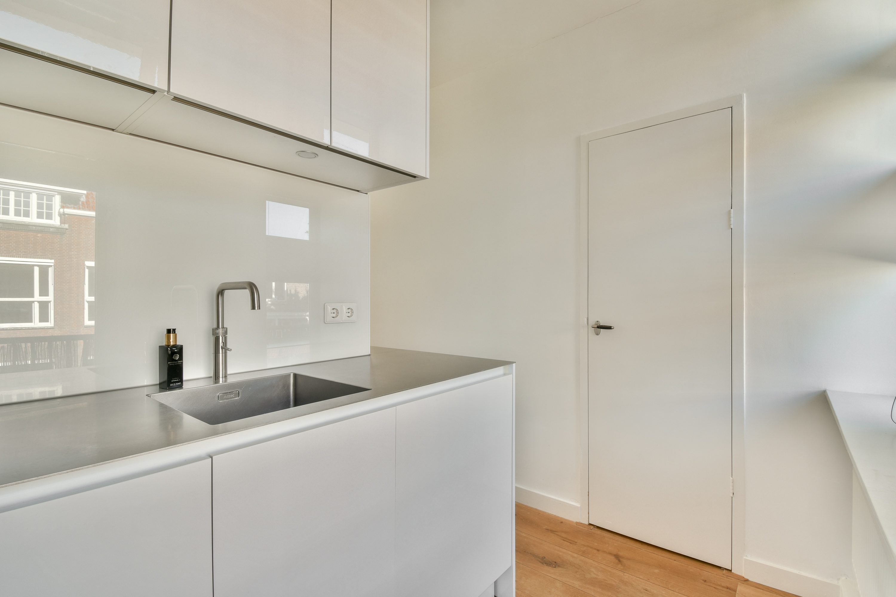Via the staircase you reach the entrance of this lovely apartment on the third floor. In the hall there is space to hang your coats and the bathroom is located. The neat bathroom has a sink, shower and a toilet. At the front is the cozy, bright living room. From the living room there is access with a fixed staircase to the roof terrace. The lovely spacious roof terrace is approx. 28 m2. Next to the living room you will find a flexible space that can be used as a study/work room or as a 2nd bedroom. At the rear of the apartment is the kitchen and a spacious bedroom. The kitchen is equipped with a combi oven, refrigerator, dishwasher, 4-burner gas stove, Quooker and a sink (built-in appliances from Siemens). In addition to the roof terrace, you also have access to a balcony facing west from the bedroom and the kitchen.