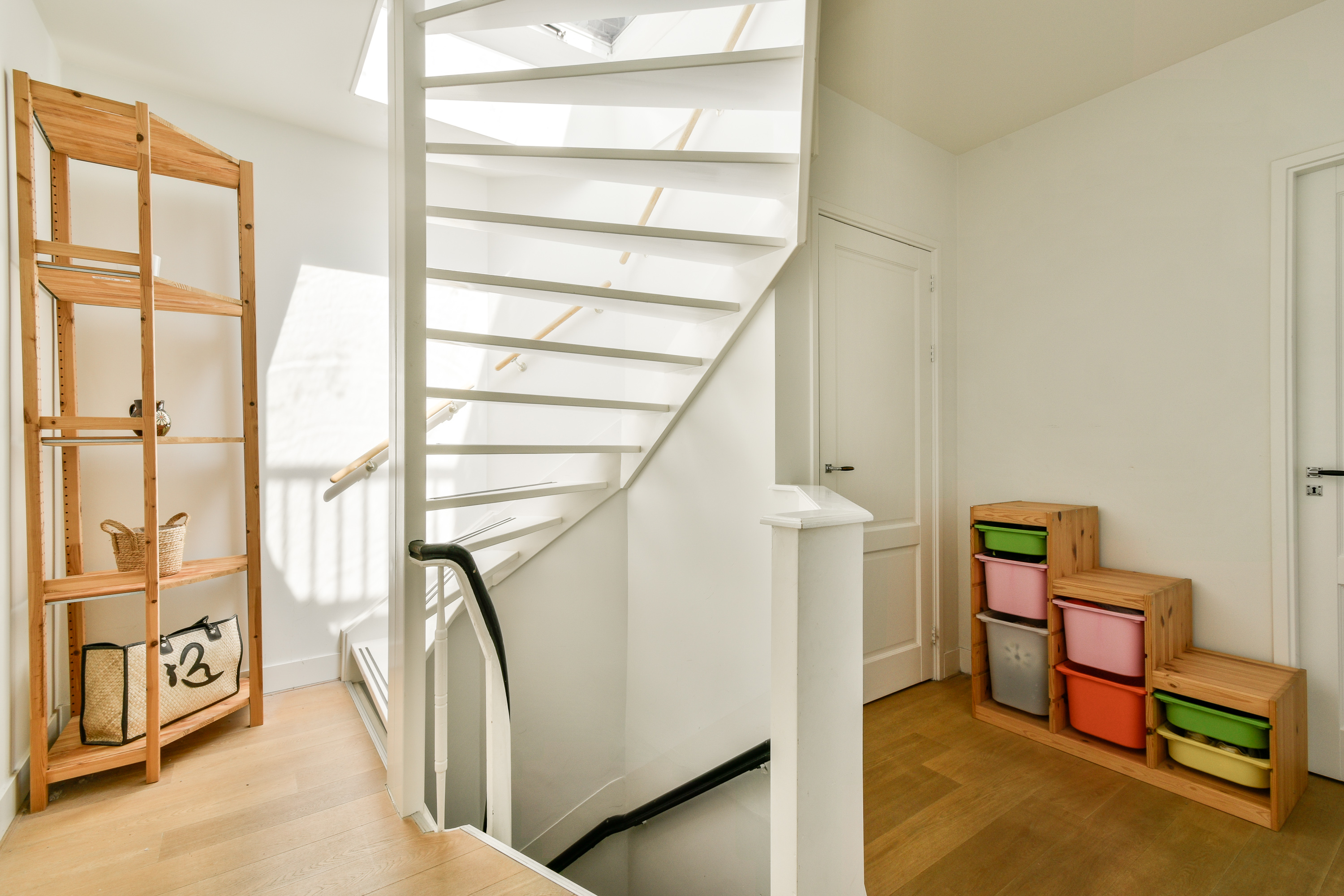 Via het gemeenschappelijke trappenhuis (gedeeld met slechts twee andere appartementen) bereikt u op de tweede verdieping de entree van de woning. Een interne trap leidt naar de derde verdieping, waar u uitkomt op de overloop met een apart toilet.