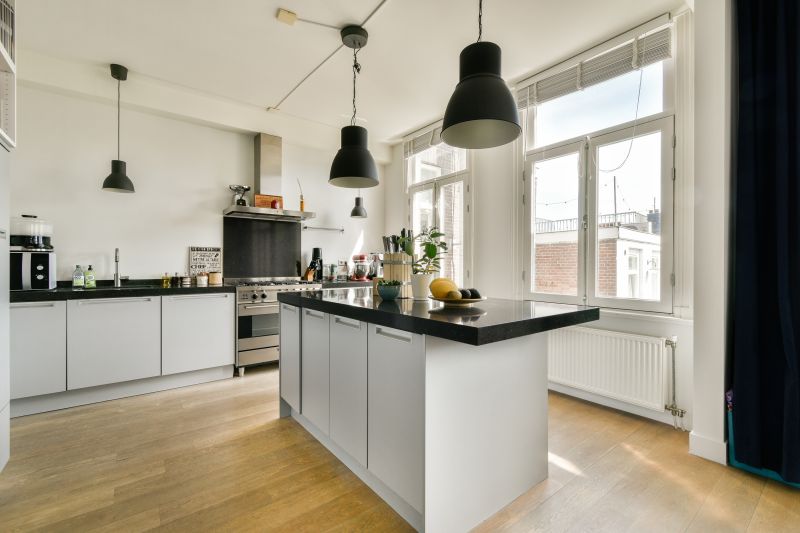 The expansive and bright living room features large windows at both the front and rear. At the rear, you'll find the modern open kitchen with a cooking island, ample workspace, and various built-in appliances. French doors open onto the balcony, overlooking the lush inner gardens. The high ceilings add a touch of elegance and a wonderful sense of space.