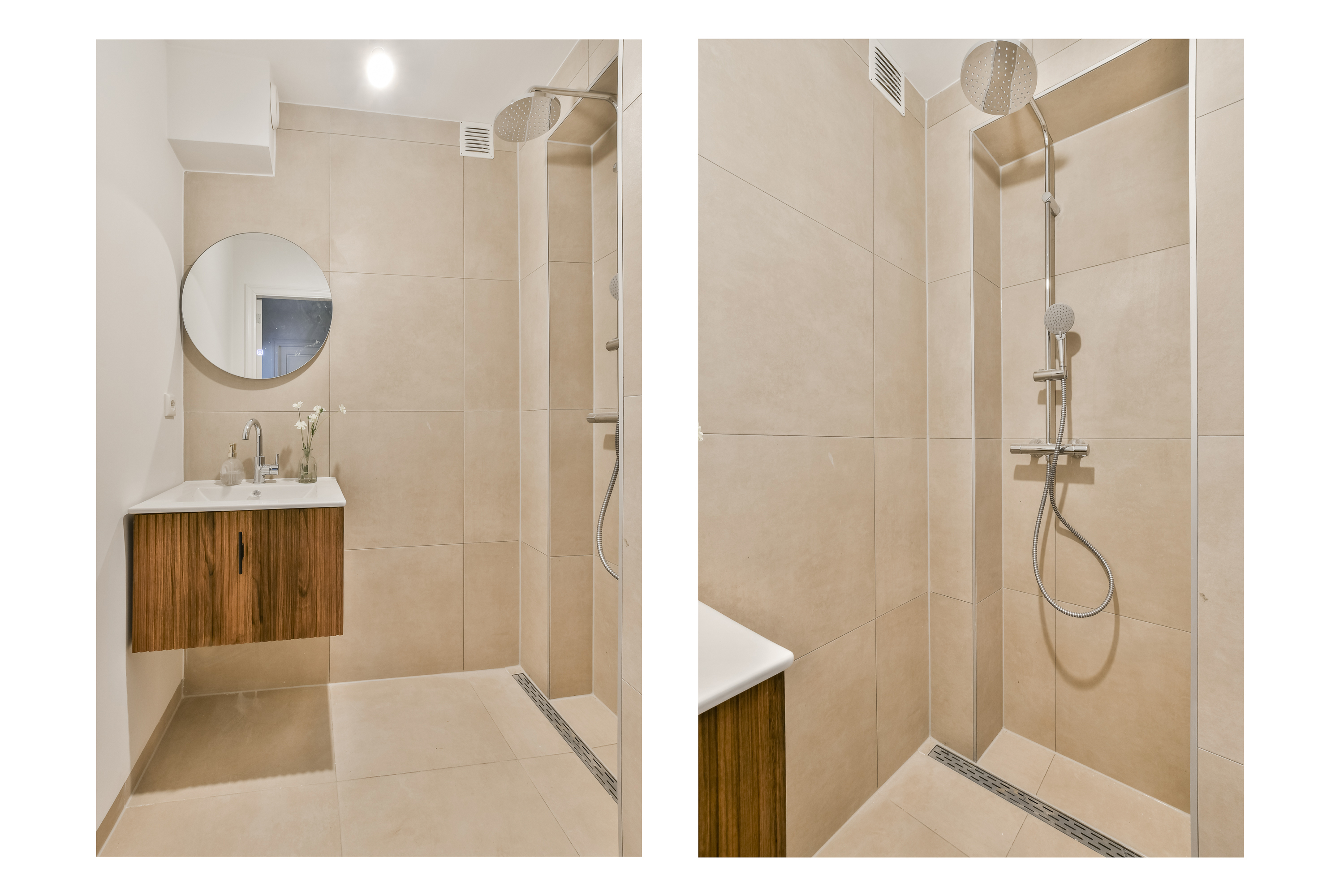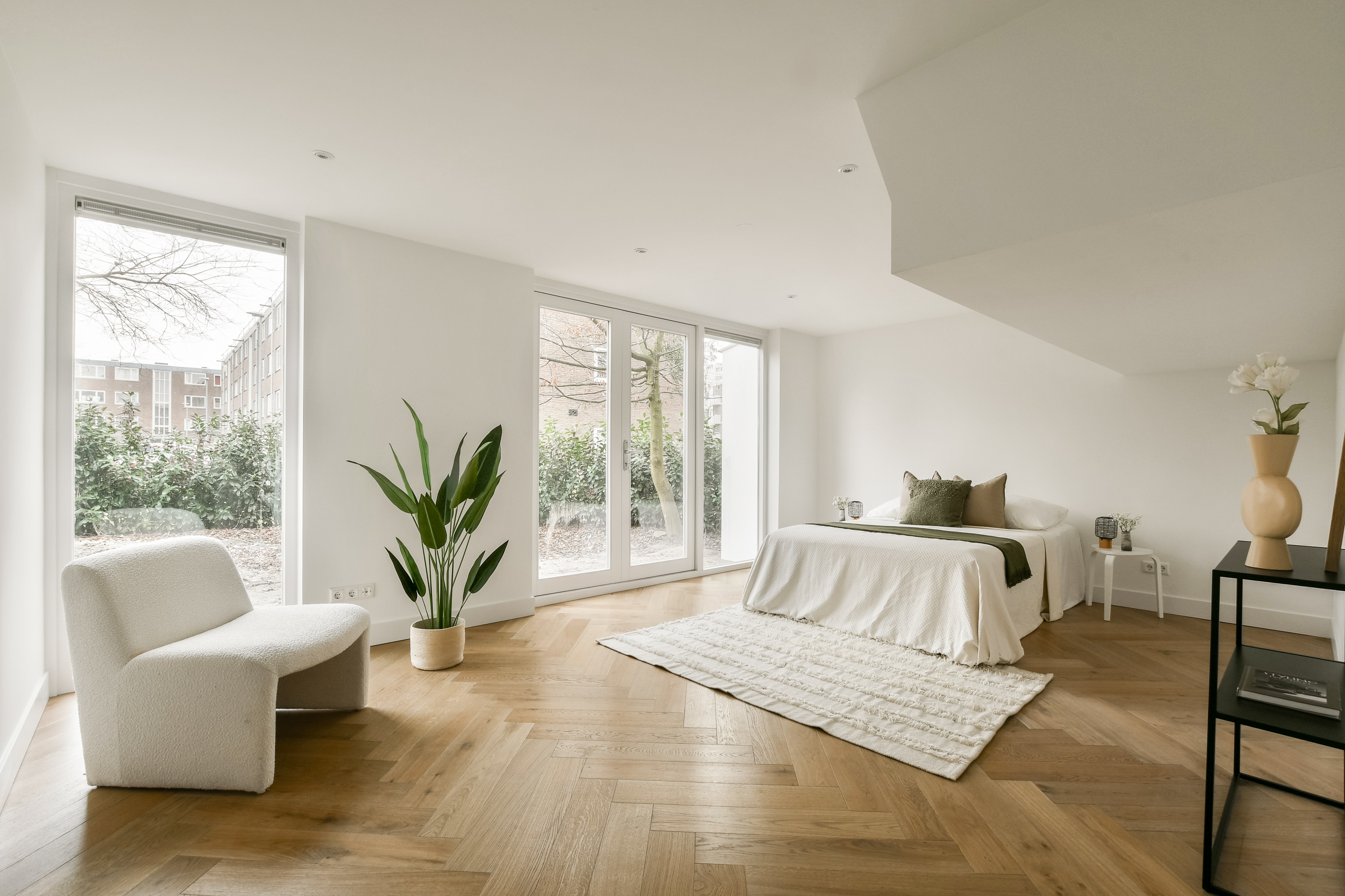 Through the shared hallway with staircase, you reach the private entrance on the ground floor. This hallway features a separate toilet and access to all rooms. The spacious living room is wonderfully bright and provides access to the kitchen/diner in the garden-facing extension. Connections have been made for a kitchen with an island layout, which the buyer must still purchase. French doors open onto the delightful garden. Two well-sized bedrooms are located at the front of the apartment, each with a bathroom equipped with a shower and sink. The master bedroom is truly enormous and comprises a walk-in closet, a luxurious bathroom with a bathtub, double vanity, and walk-in shower, a separate toilet, a washer/dryer cabinet, and the sleeping area on the garden side. French doors from the bedroom also provide access to the garden.